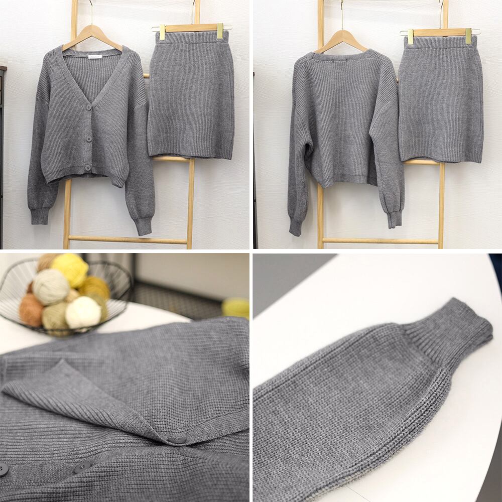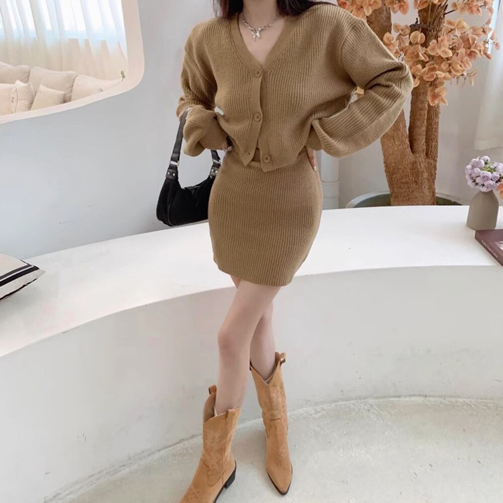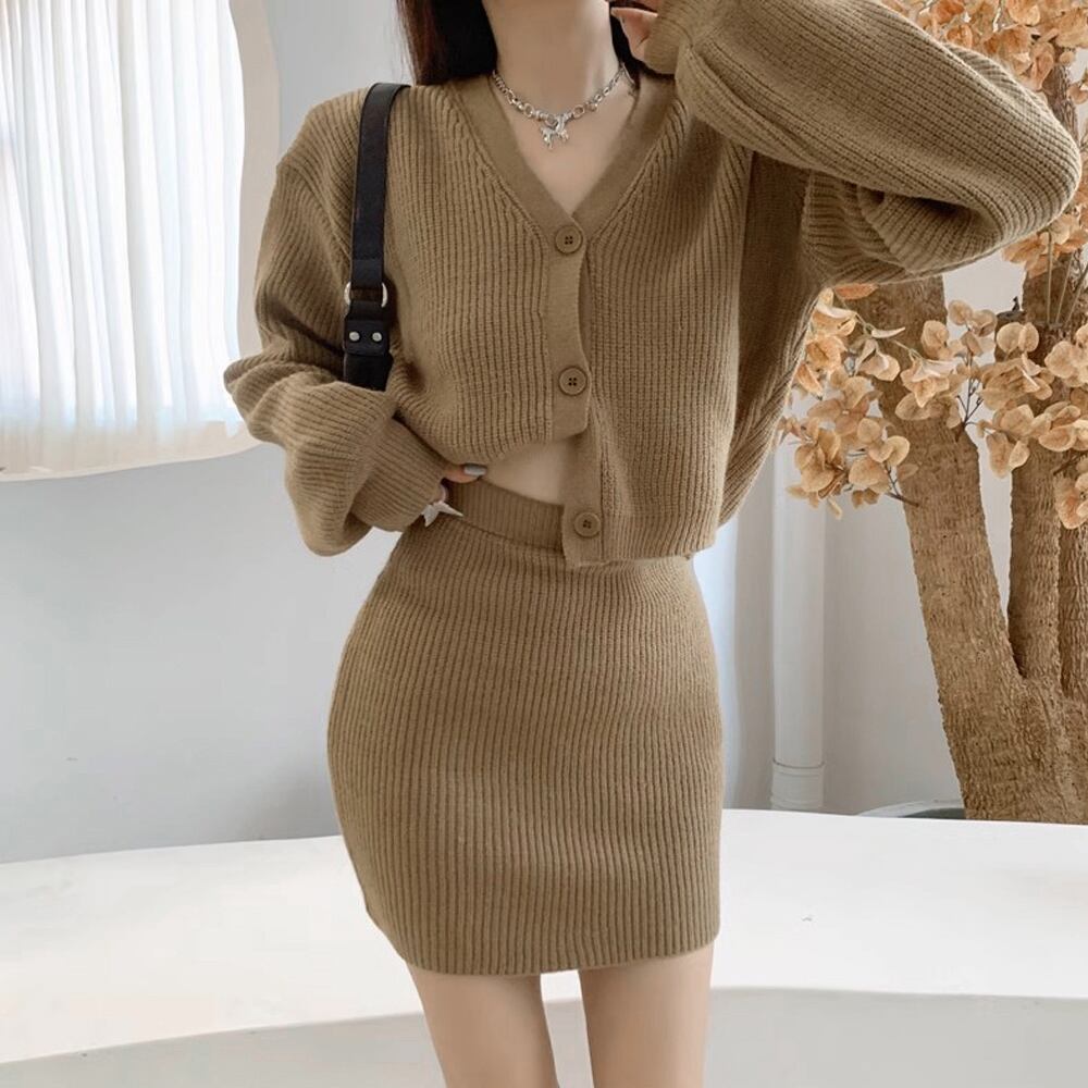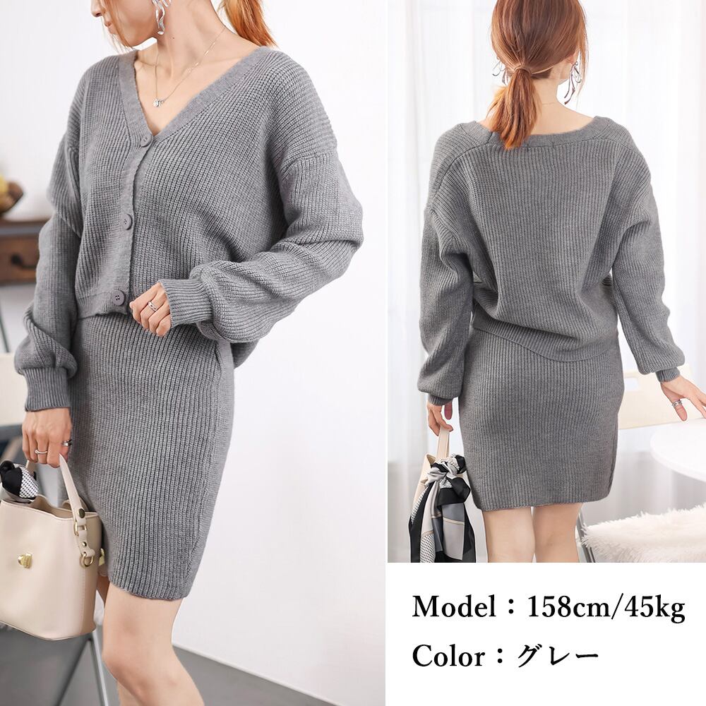 ニットアンサンブル リブ編みニットカーディガン ショート丈 Vネックトップス 長袖 ニットスカート ミニスカートセクシー