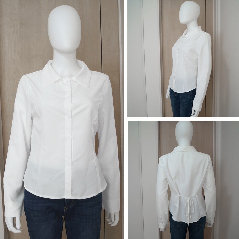 バックスタイルはリボンで調節できる長袖シャツブラウス