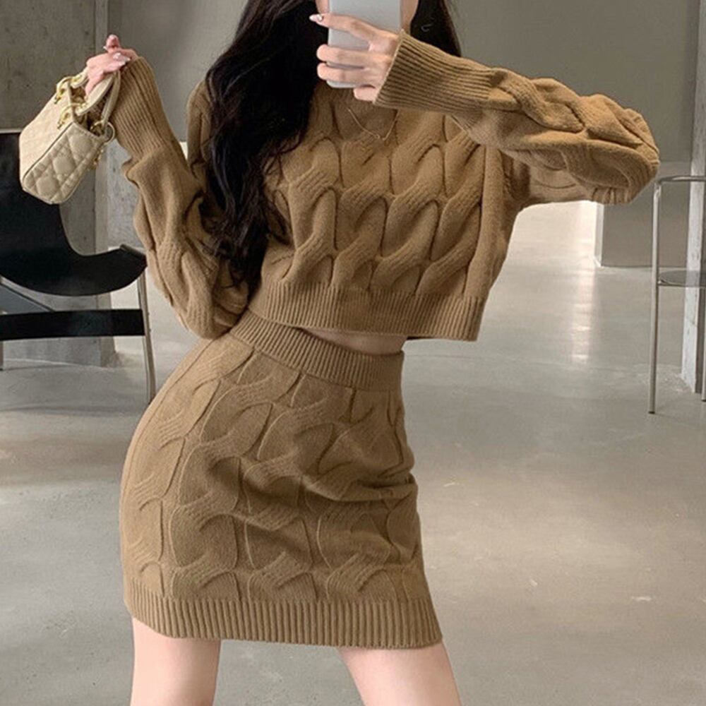 韓国上下2点セット ケーブルニット クルーネックニットセーター クロップド丈 大人可愛い ハイウエストタイトスカート秋冬
