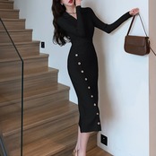 韓国ファッション ミディ丈ワンピース セクシーリブニット きれいめタイトワンピースVネック ボディコンワンピース 着やせ