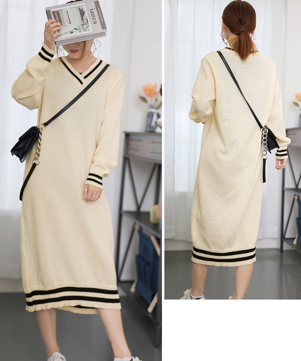 柔らかいニット生地が、ストンとした縦長Iラインシルエットを演出するニットロングワンピース