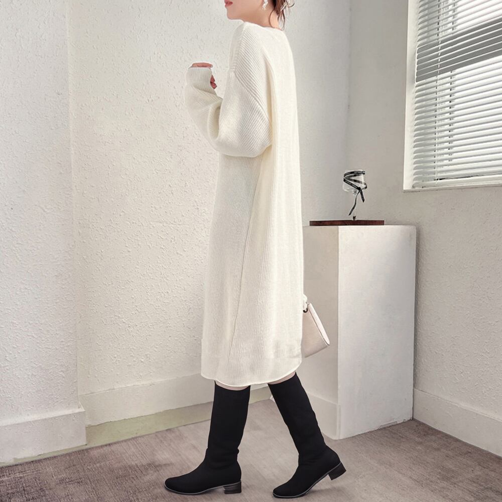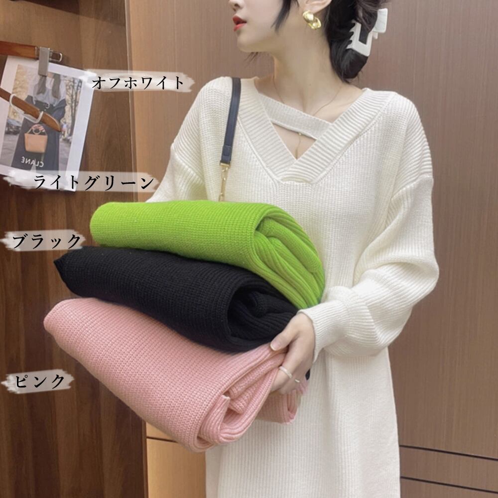 ネックストラップワンピース ドロップショルダーニット vネックワンピース 上品 ゆったりワンピース おしゃれ 体型カバー