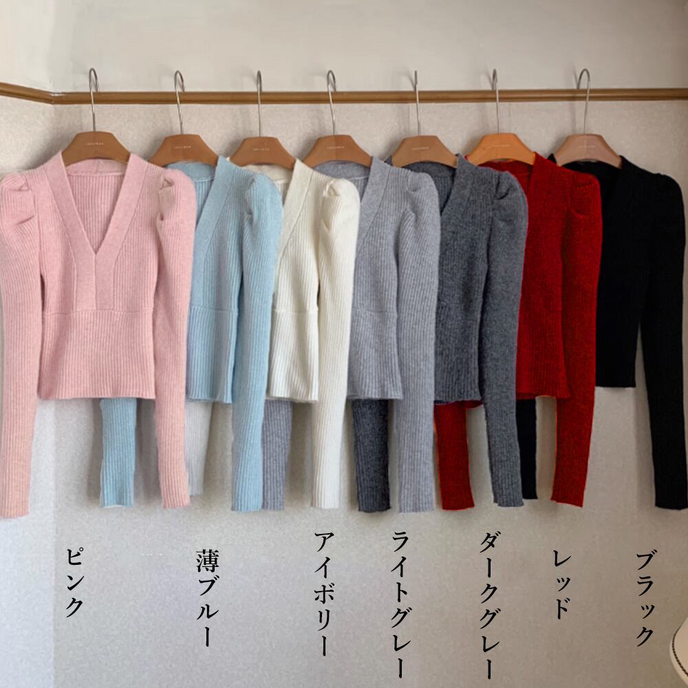 リブニットトップス 長袖 パフスリーブ 細見え ニットセーター 大人セクシー きれいめニットカットソー 無地 フェミニン