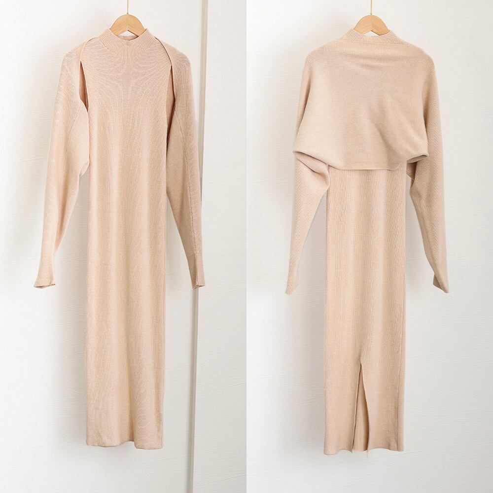 フェミニン 秋冬ロングワンピース ボレロカーディガン セットアップ きれいめ 韓国 無地タイトワンピース バックスリット