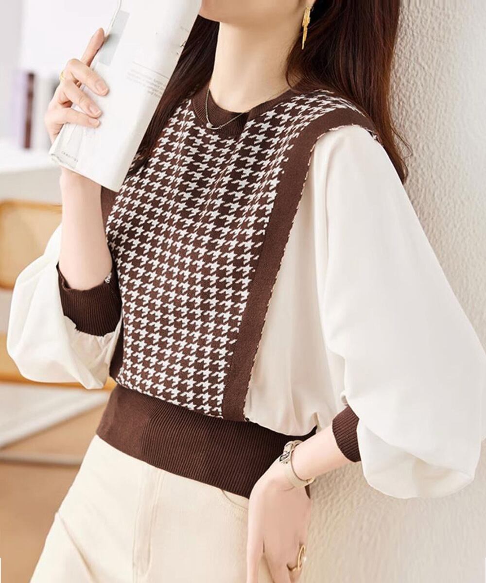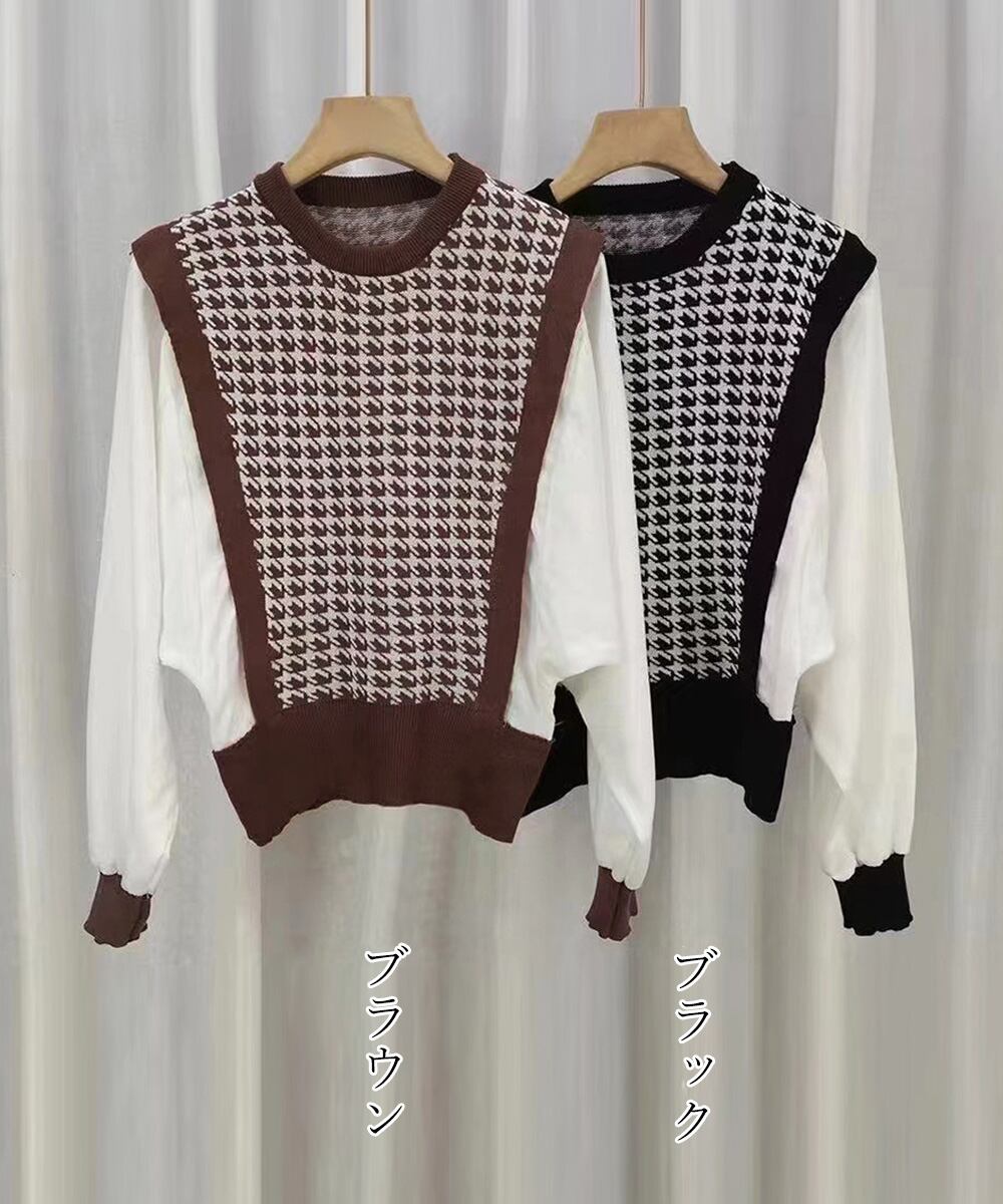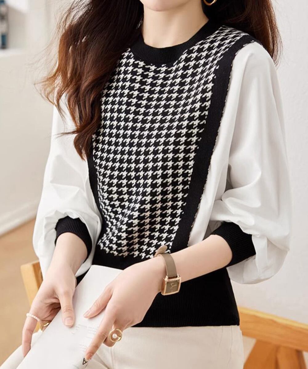 レディース 切り替えニットトップス バルーンスリーブ 韓国風 千鳥格子 ニットプルオーバー カジュアル ニットブラウス