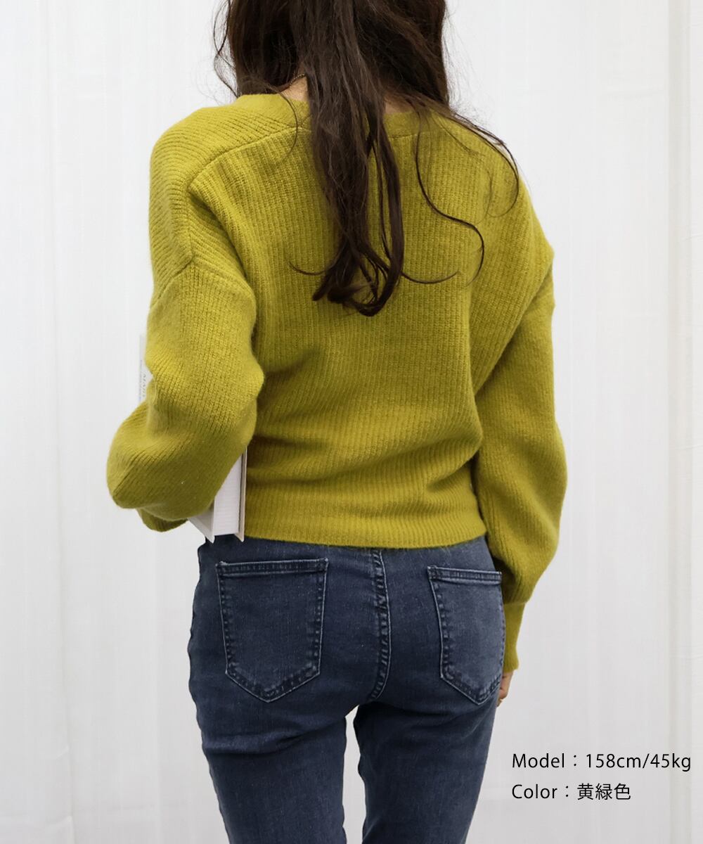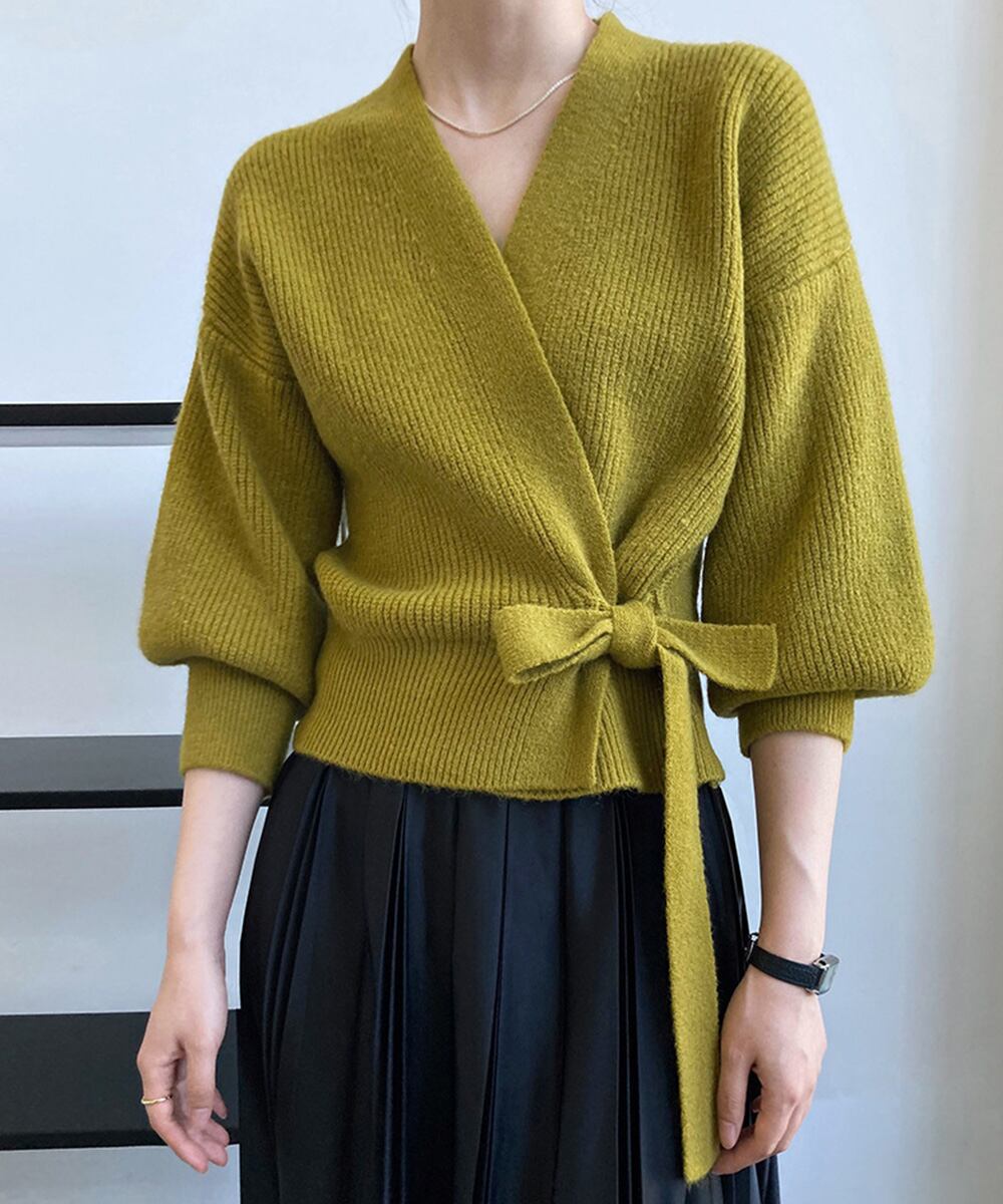 Vネックでデコルテラインを美しく魅せ、女性らしさを演出する韓国新作DESIGNのカシュクールニットトップス