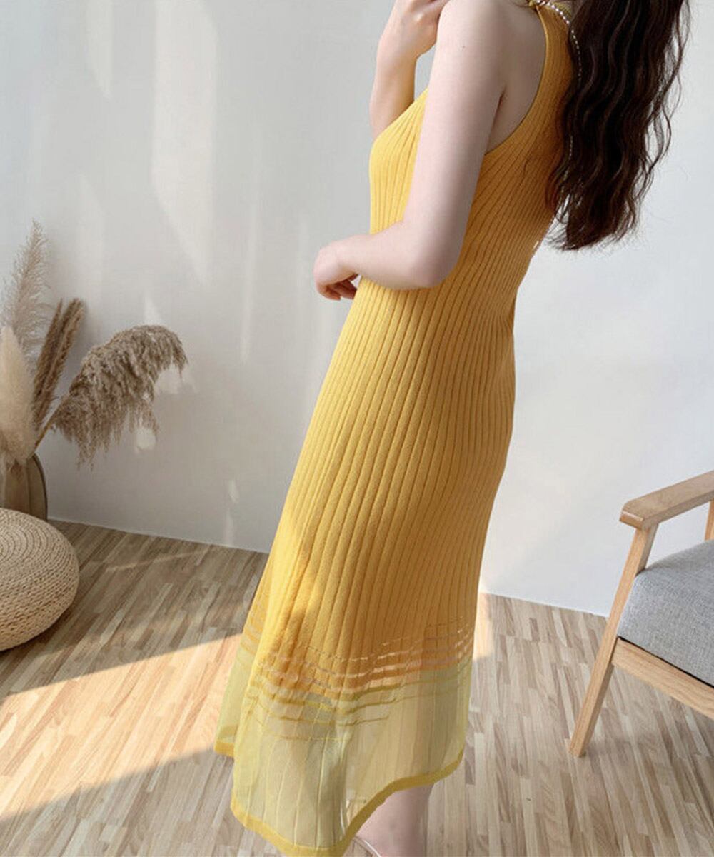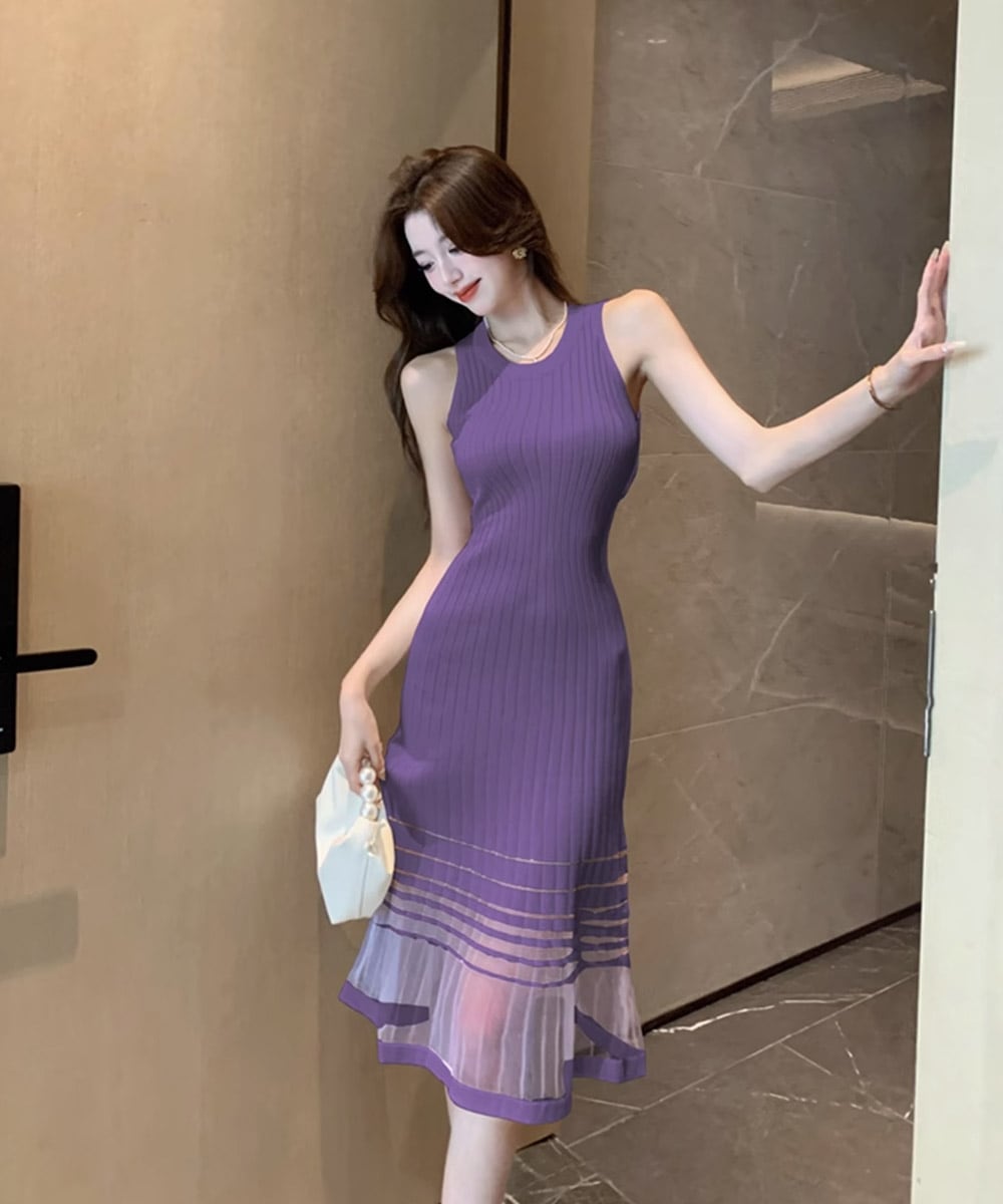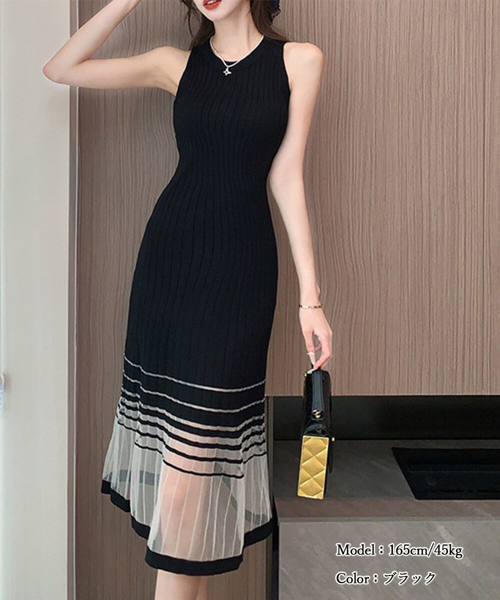 可愛い ノースリーブワンピ ラウンドネック タイトワンピース ドッキング ひざ丈 シンプル 上品 カジュアル 韓国風
