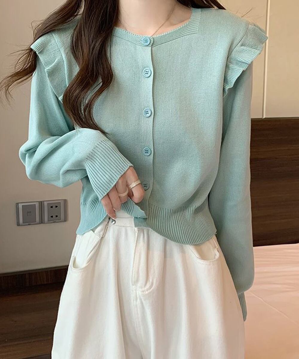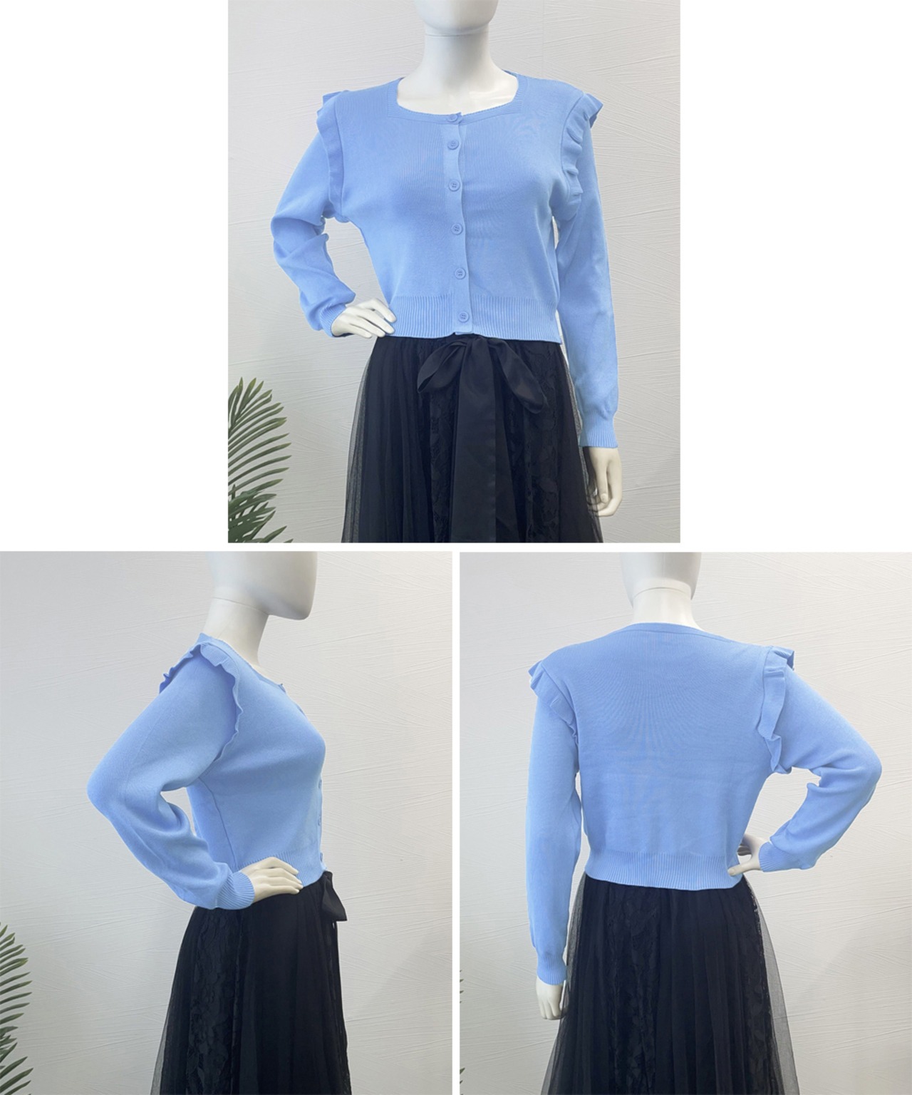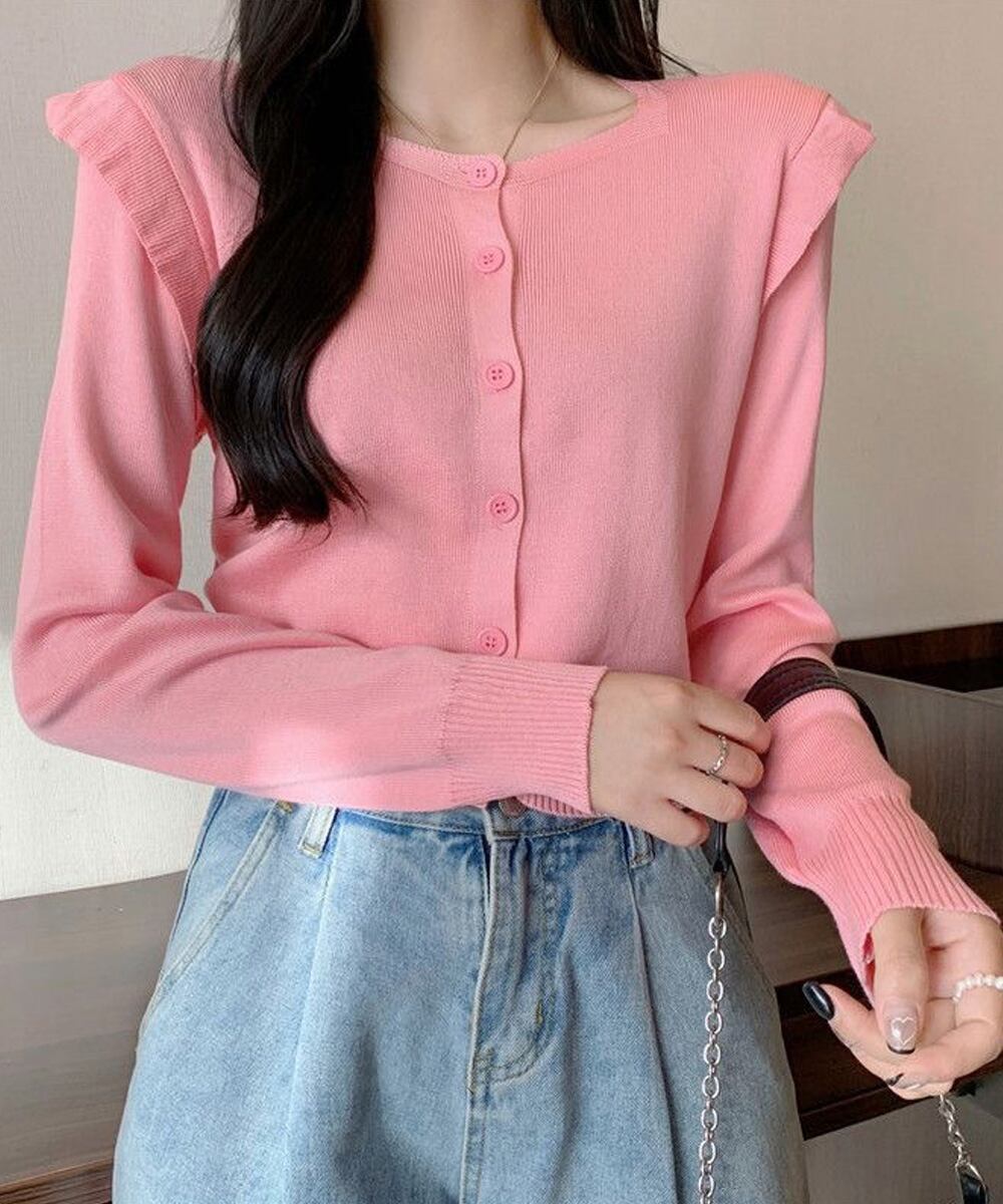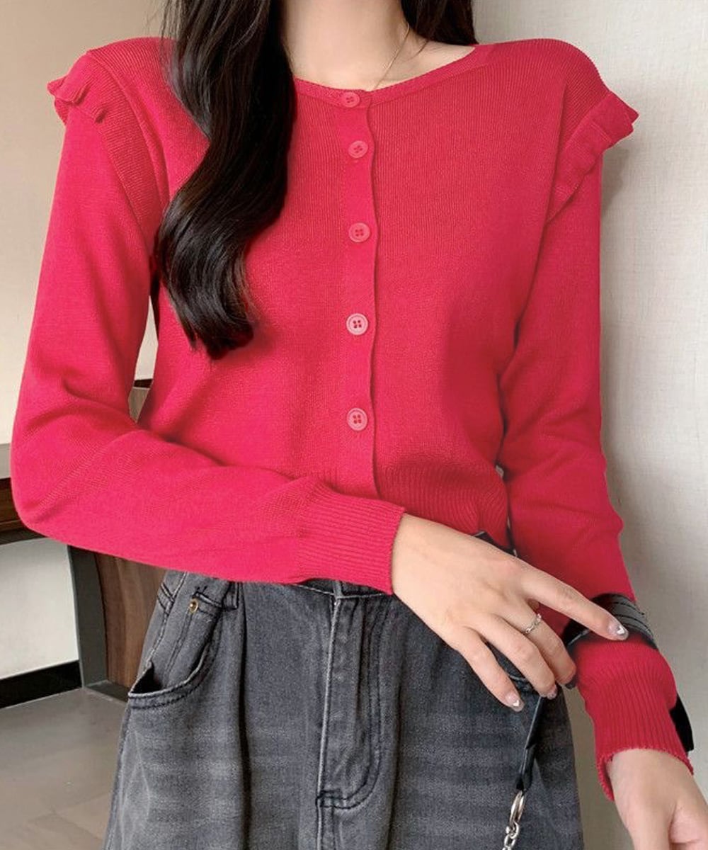 肩周りフリルのデザインが可愛らしいニットカーディガン