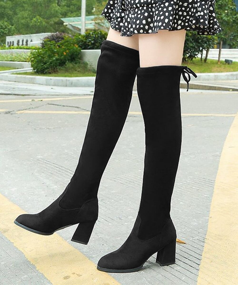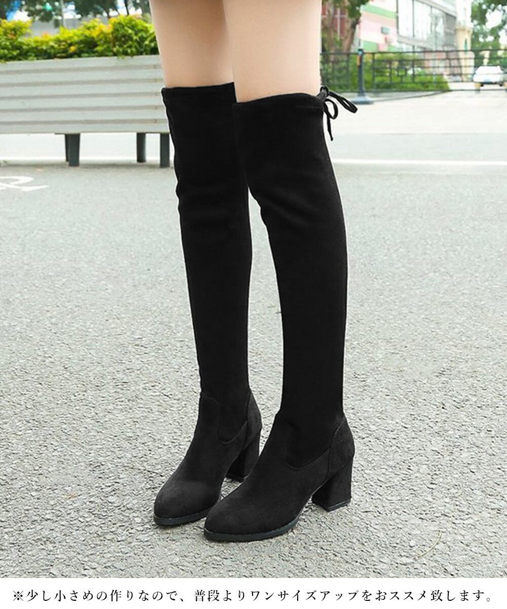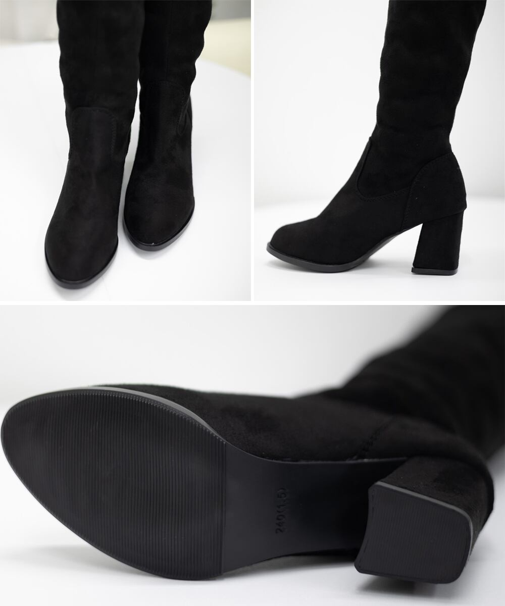 スエード調 ストレッチ 膝上ブーツ 歩きやすい チャンキーヒール秋冬靴 美脚脚長ブーツ 裏起毛防寒あったかブーツ 細見せ