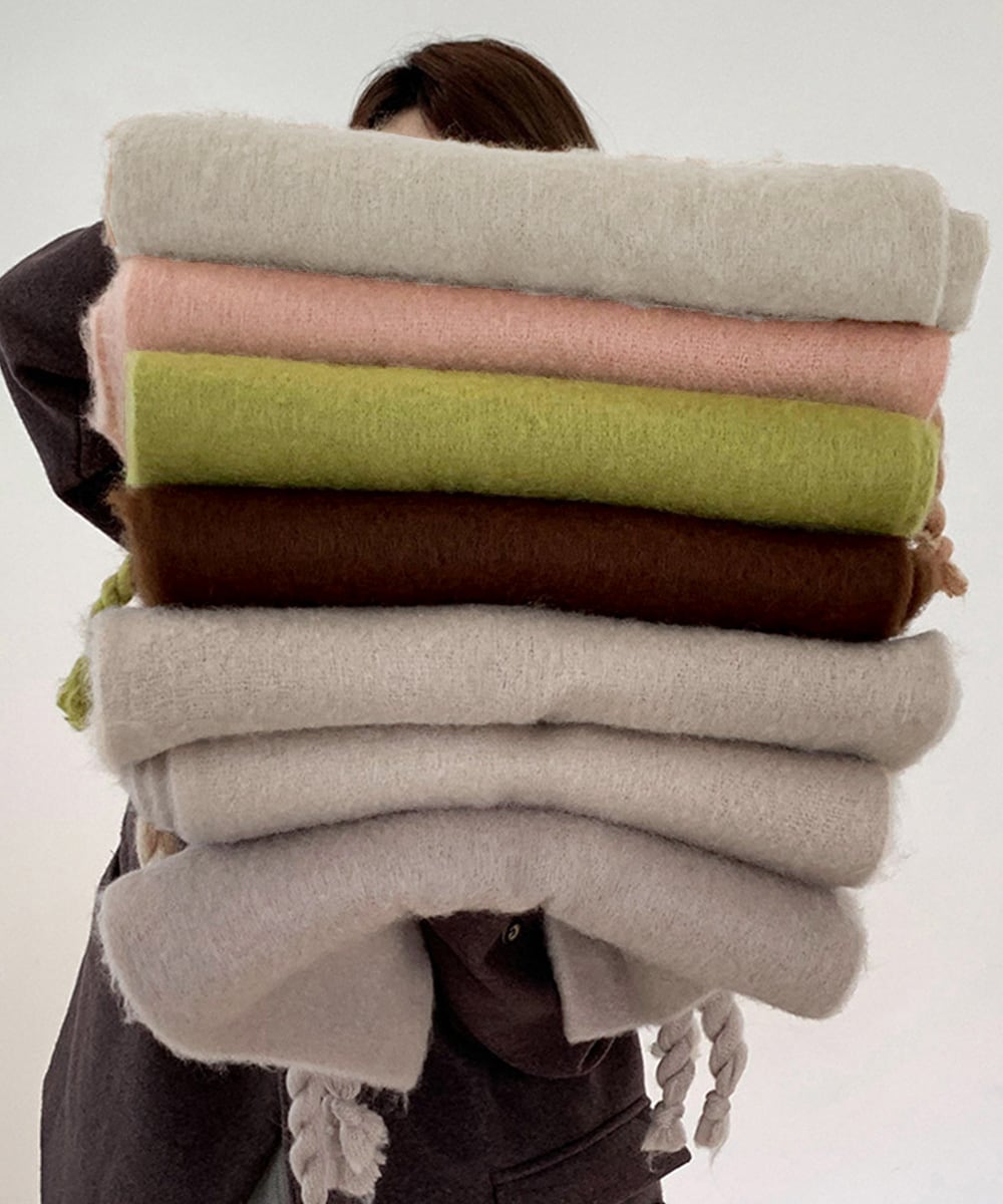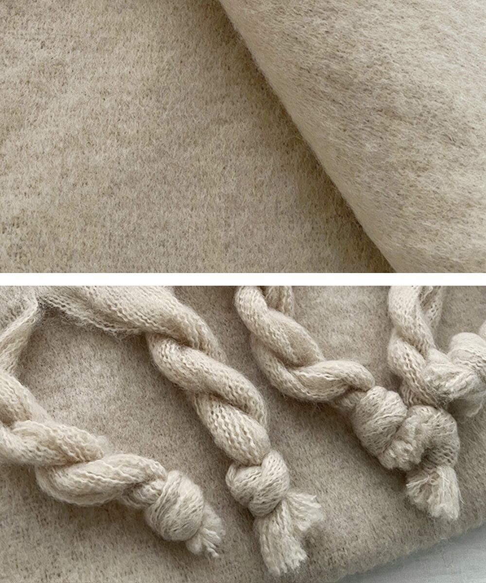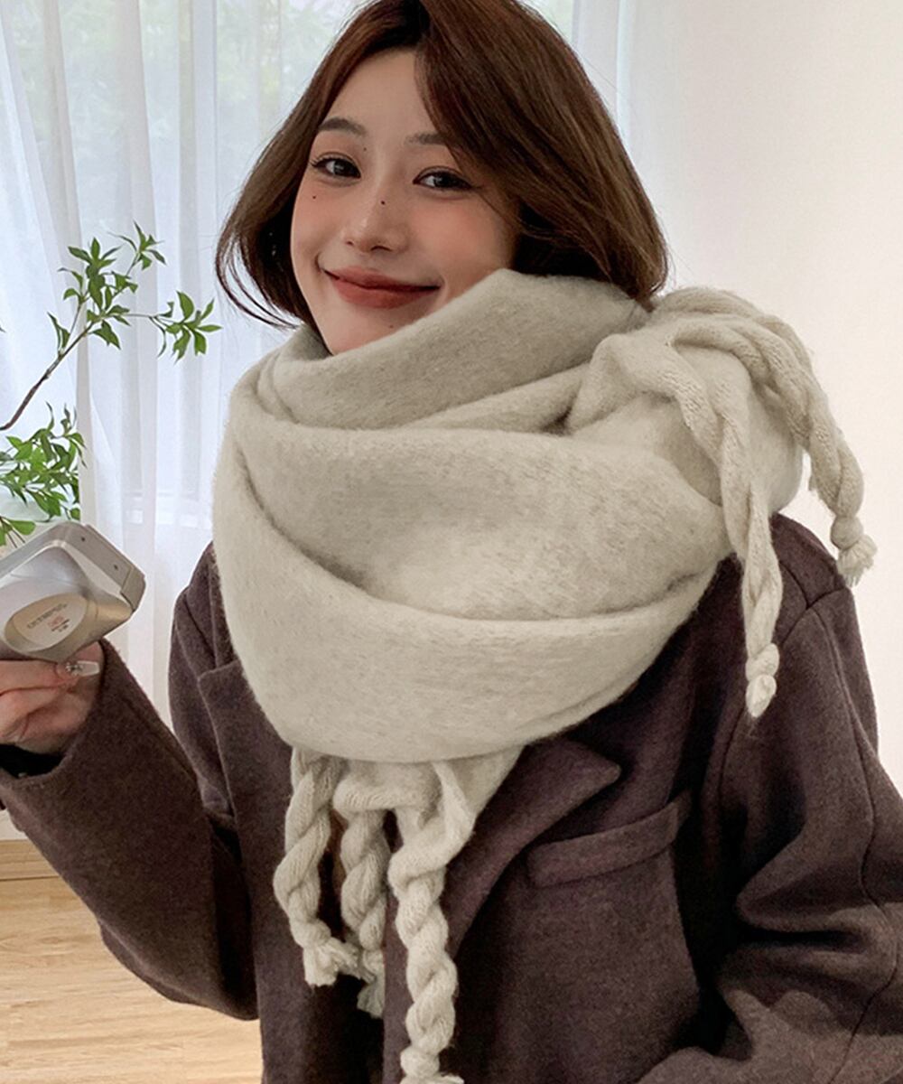 ねじれDESIGNのフリンジが大人可愛い、程よく厚手で暖かいタッセル付き無地ニットマフラー