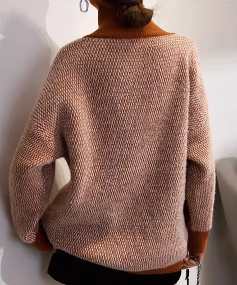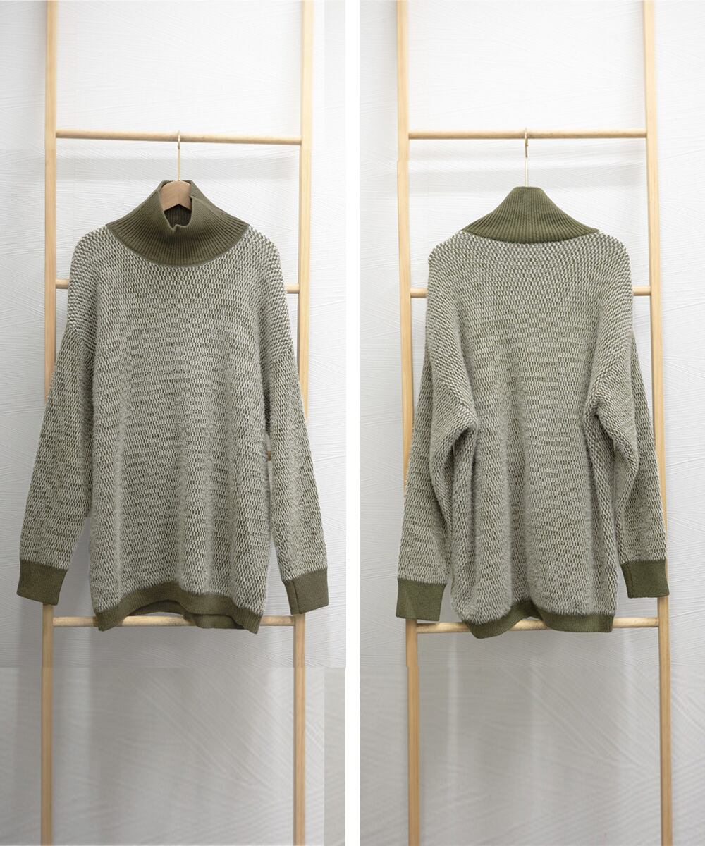 シンプルなデザインながらも、タートルネックが首元を温かく包み込み、洗練された印象を与えます