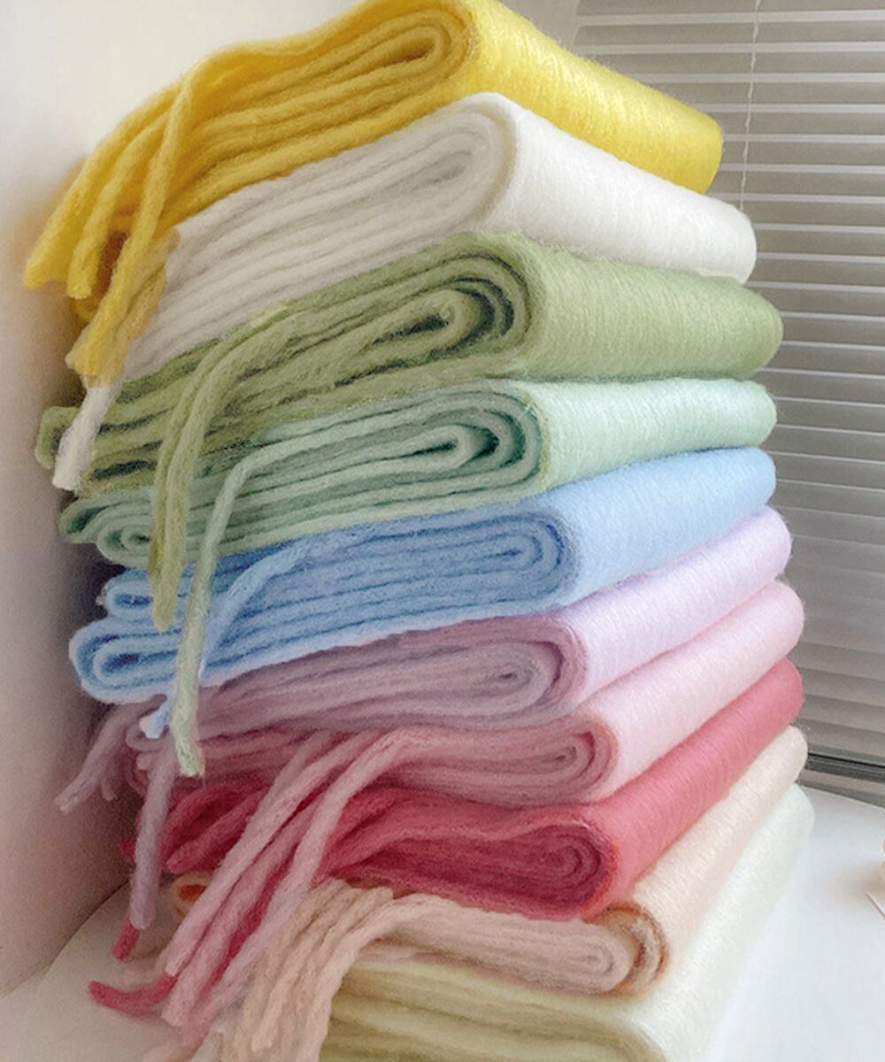 ふんわり柔らい起毛フェイクウールタッチの上質生地をたっぷり使用、暖かみとボリューム感溢れるワイドフリンジマフラー