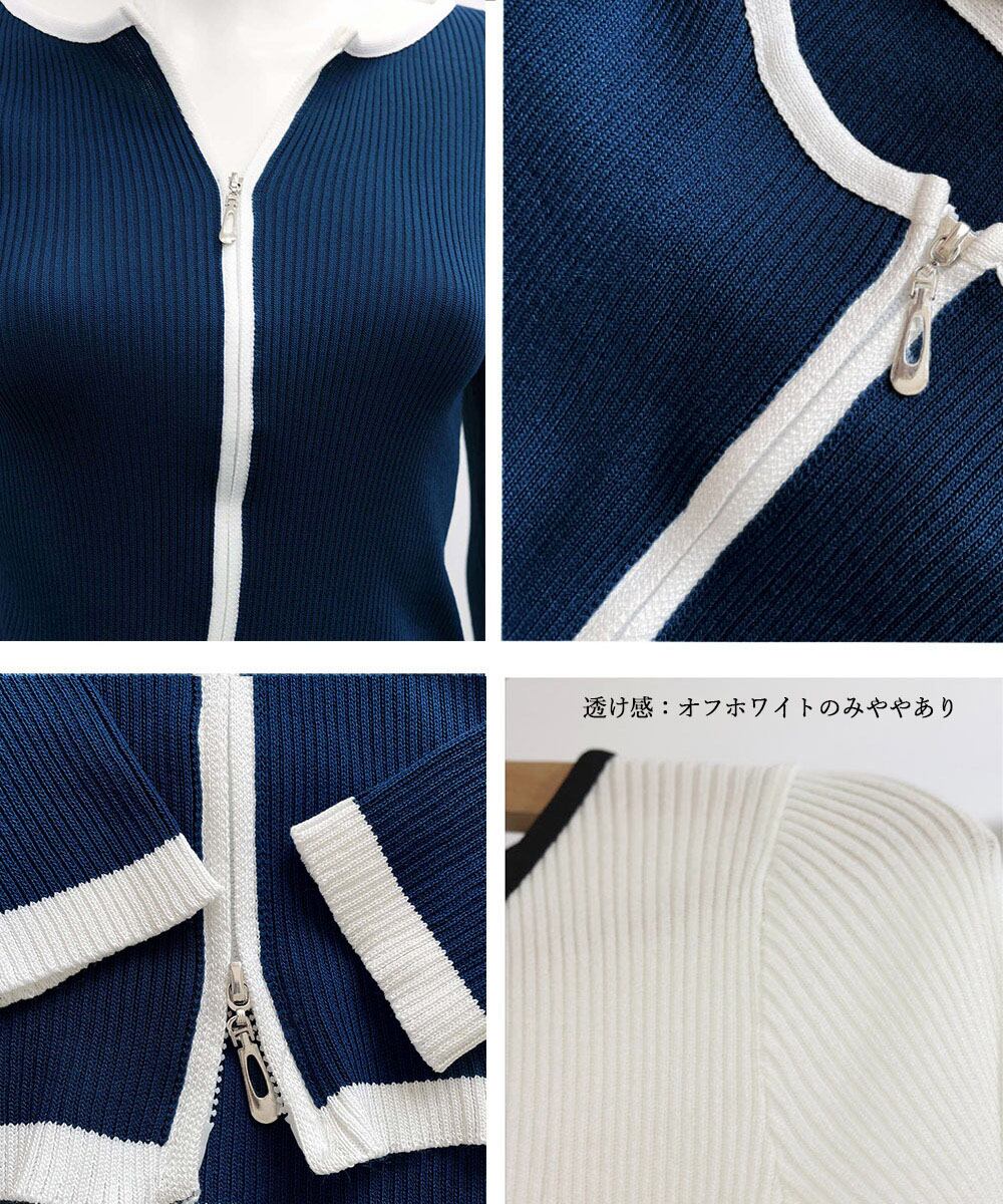 レディース 大人カジュアル フロントジップバイカラー リブニット 長袖 無地 タイトニット 着やせ セクシー