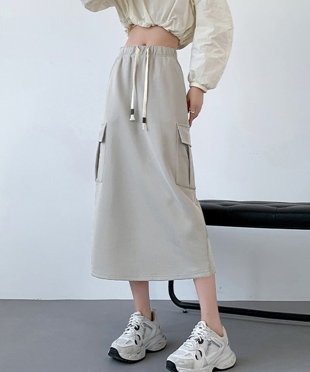 程良い丈感が魅力のミモレ丈のワークスカートです。