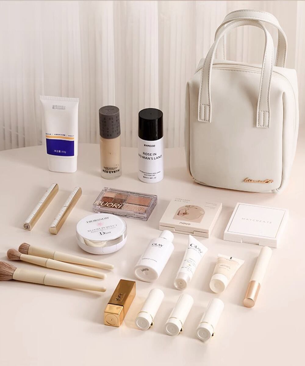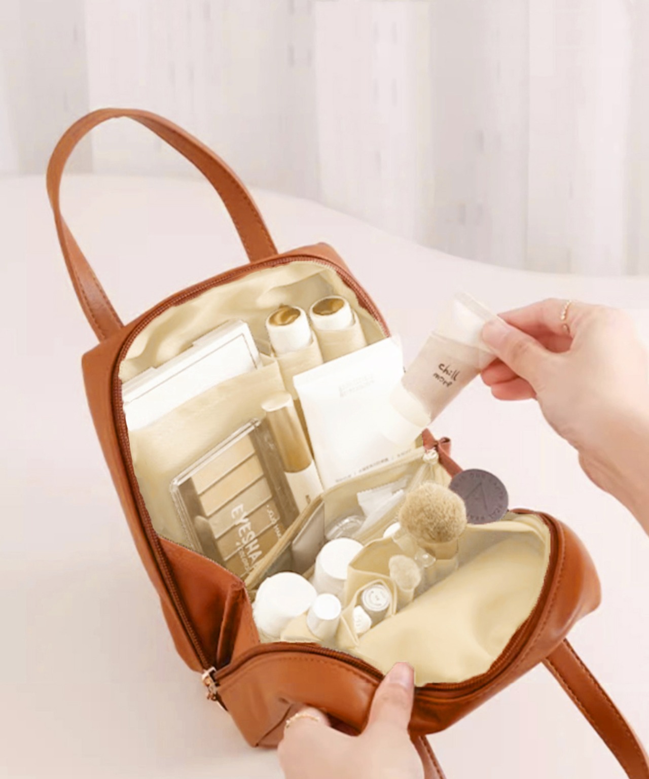 大きく開いて中身が一目瞭然で整理整頓しやすい、しっかり自立する縦型の韓国風新作化粧品収納バッグ
