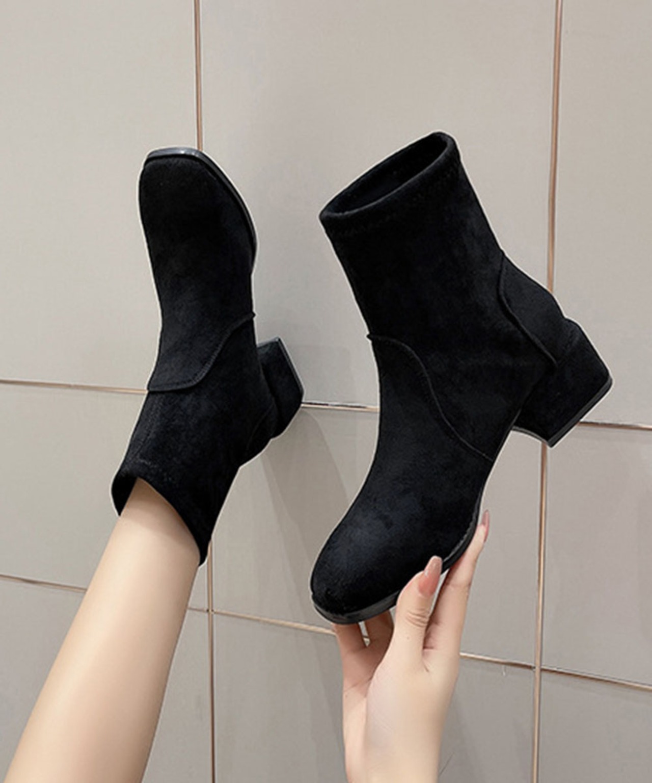 シンプルだからこそ履くだけで理想の美脚を手に入れるスエード調ショートブーティ