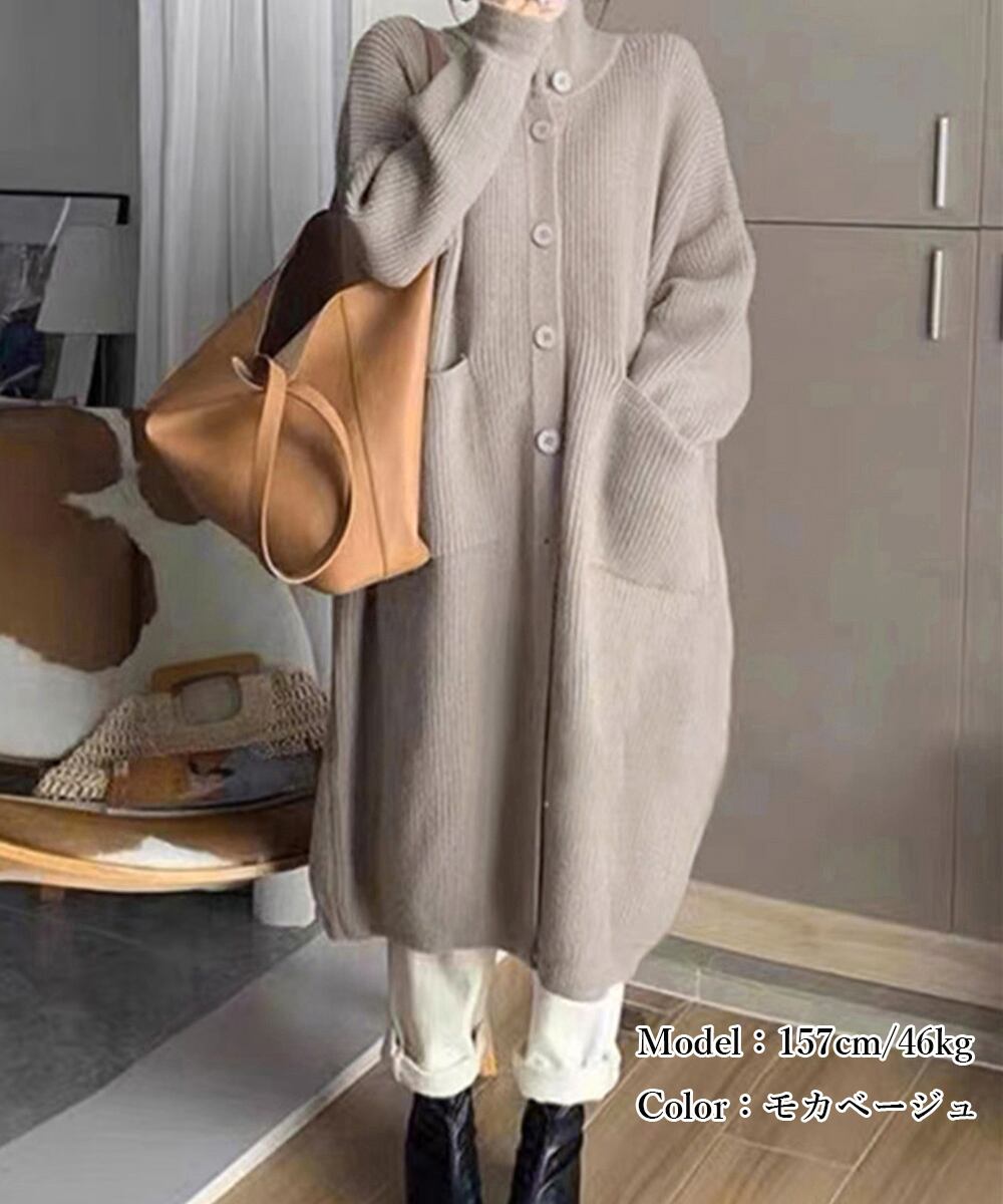 ハイネック おしゃれ リブニットガウン 着やせ オフィスカジュアル トッパーカーディガン 体型カバー ニットウェア 秋冬