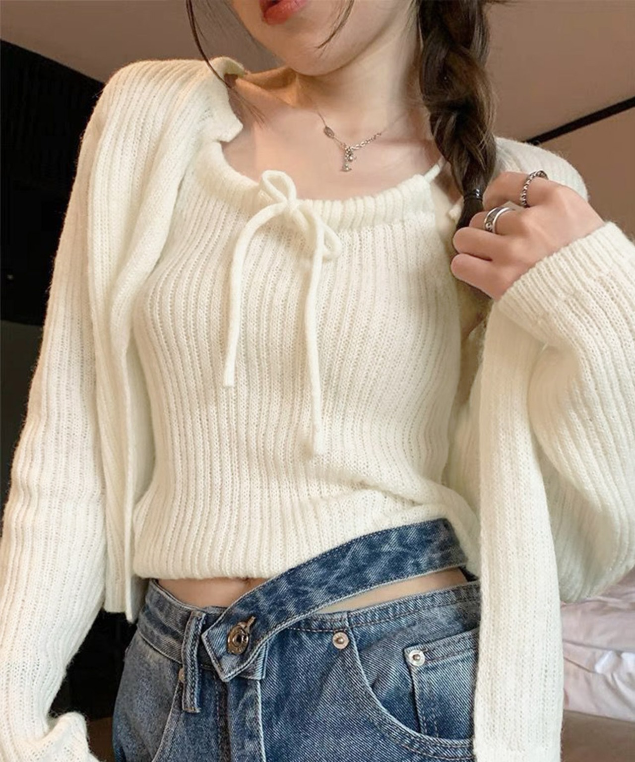 レディース 韓国風 ショート ニットカーデ リボン ニットキャミ  前開き秋服 アンサンブル 長袖ニットソー