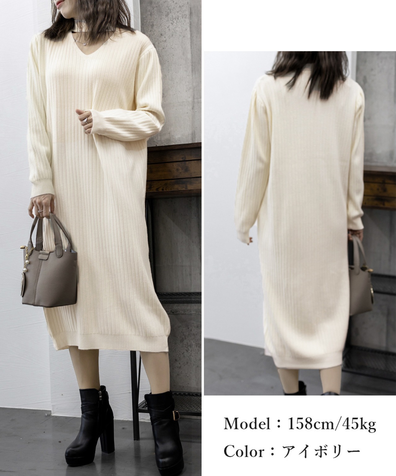 立体感のあるリブ生地を使用、体のラインを拾わず体型カバーするニットワンピース