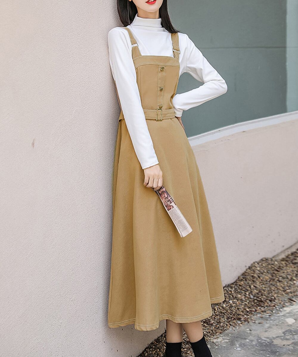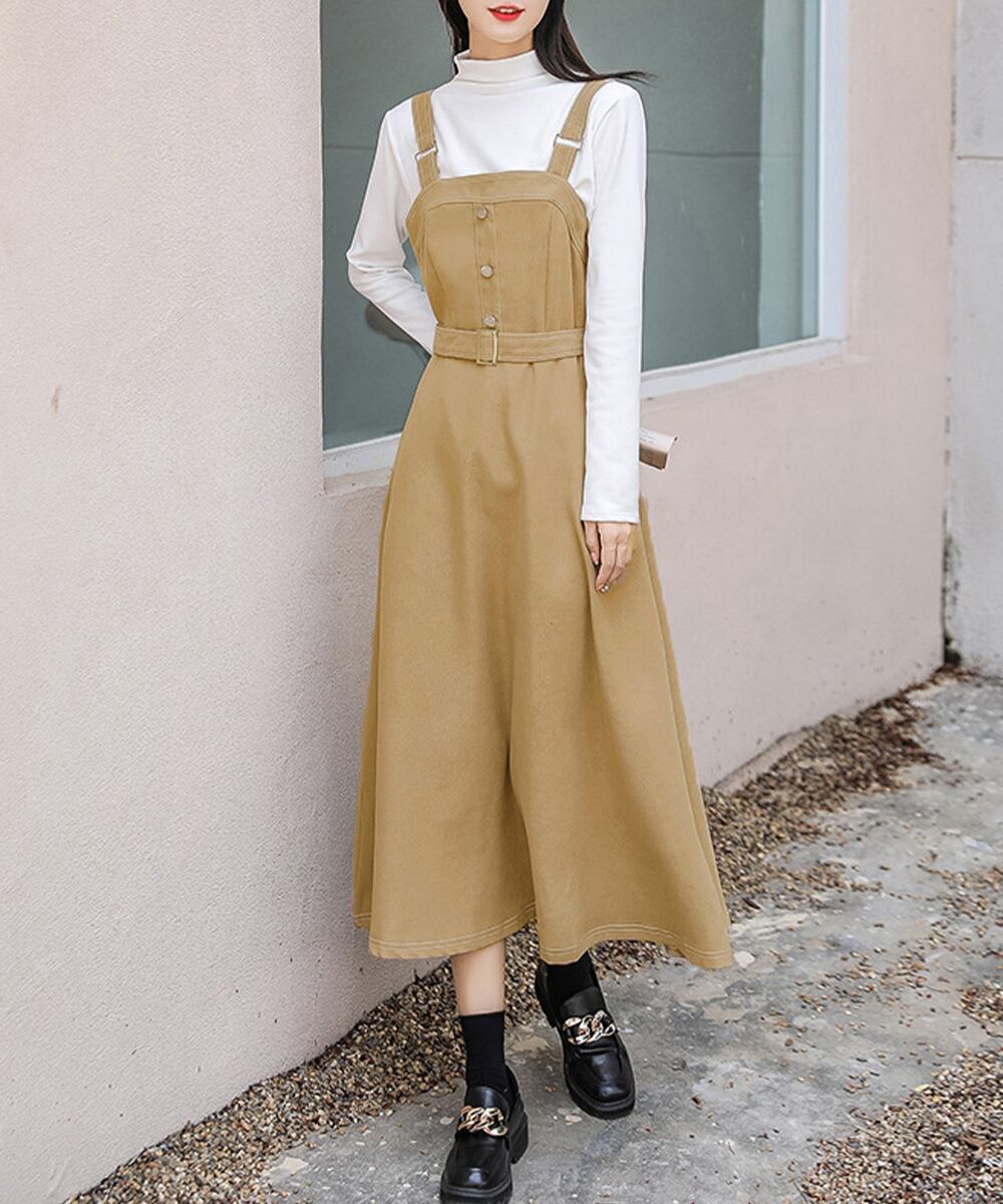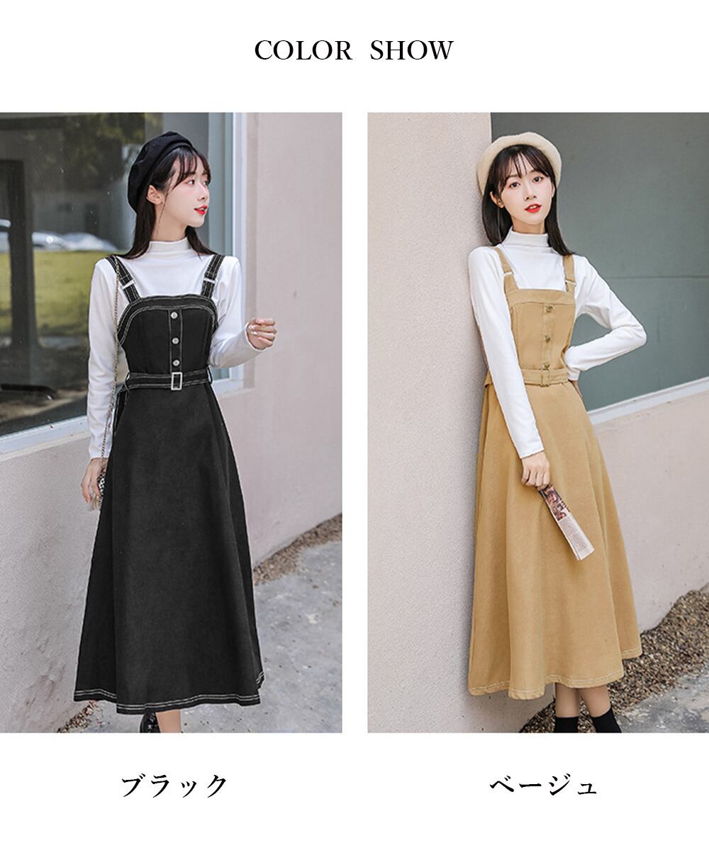 ベルト付き 配色ステッチ Aラインワンピース レディース ハイウエスト ジャンスカワンピース 重ね着 サロペットスカート