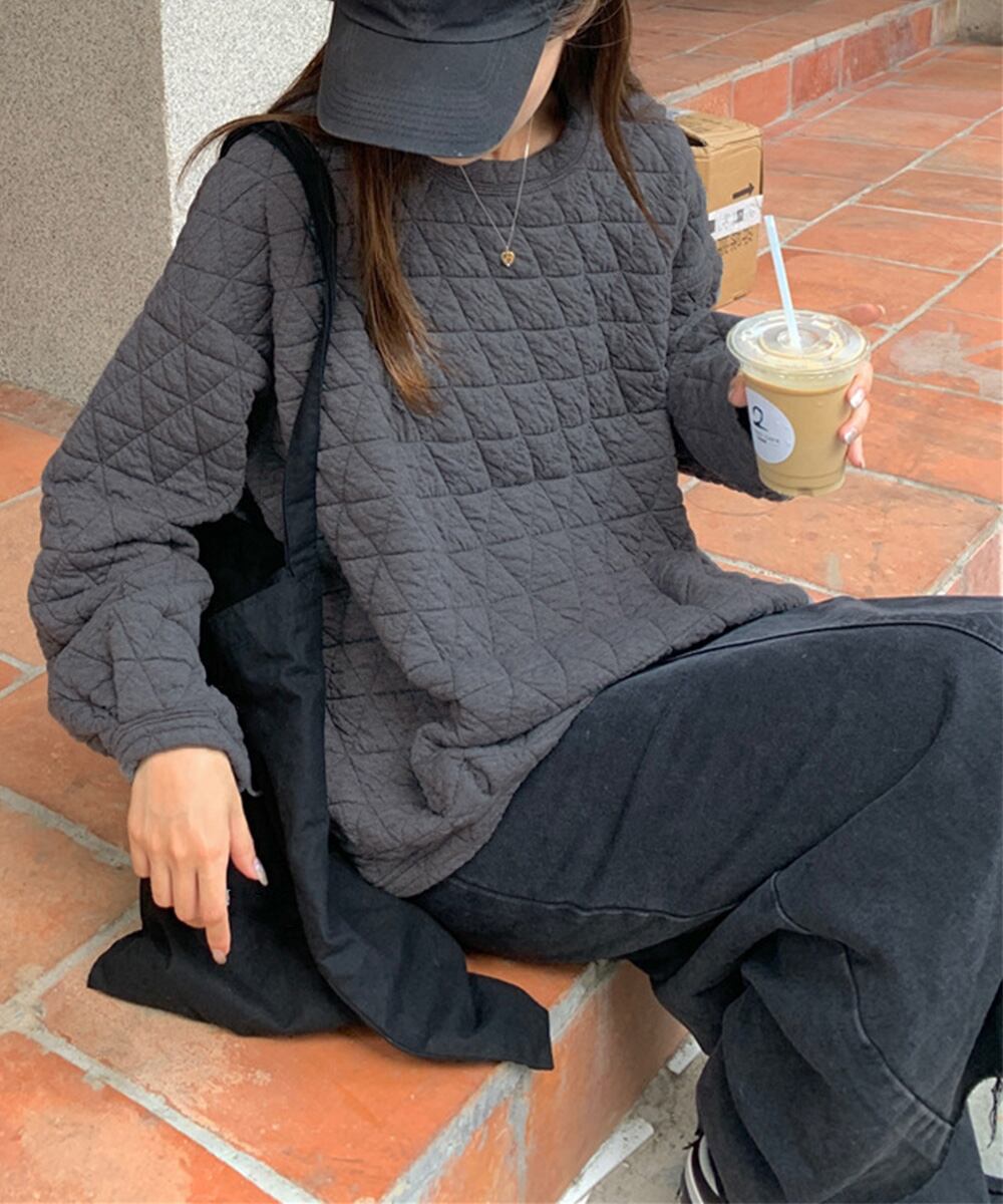 中綿入りトップス クルーネックカットソー 体型カバートップス ゆったりスウェットトレーナー ドロップショルダーカジュアル