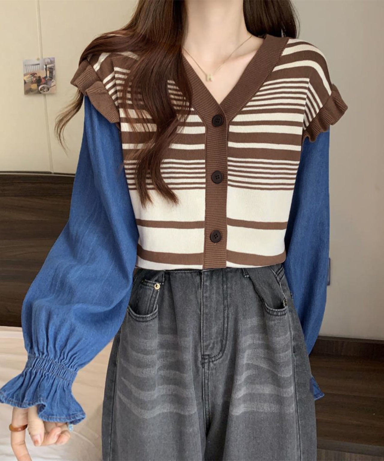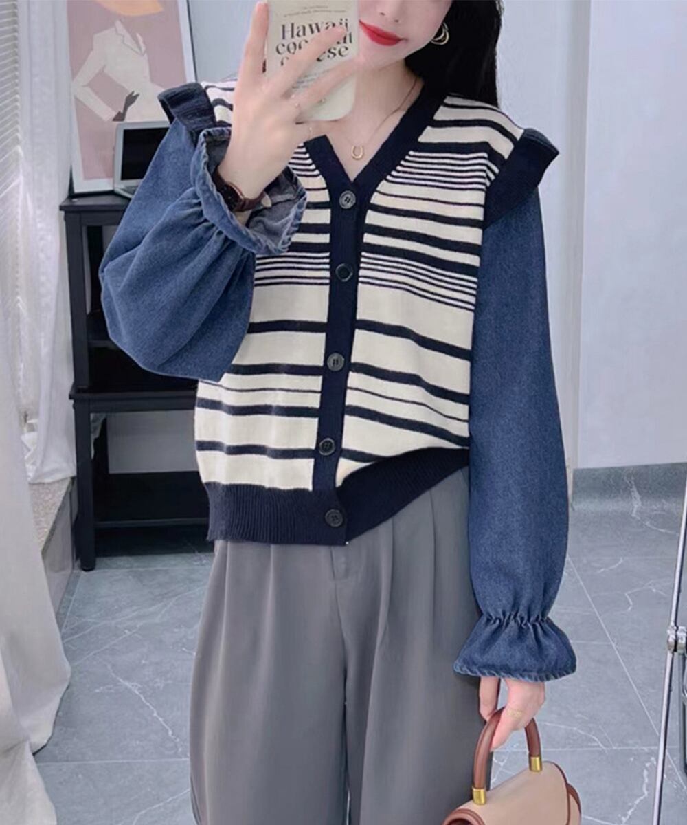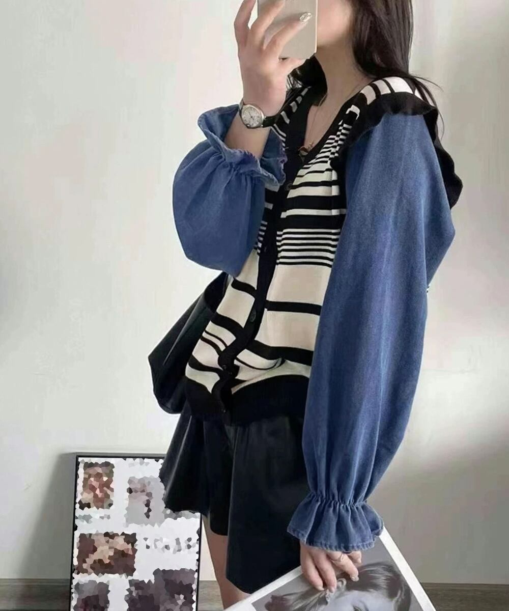 デニム袖の切り替えと肩のフリルデザインが印象的なボーダー柄ニットカーディガン
