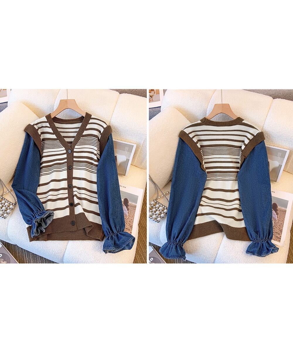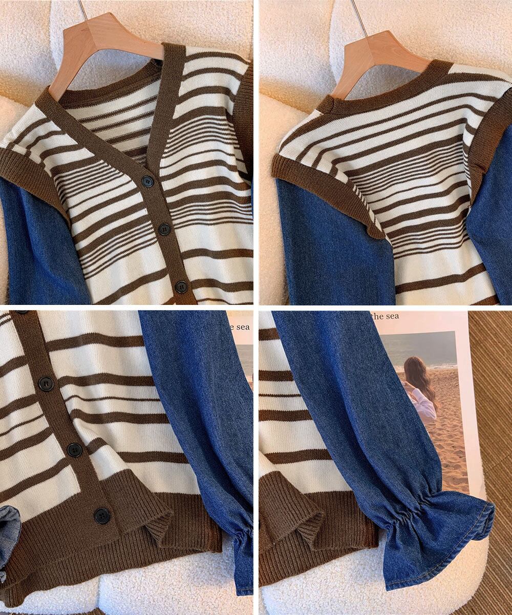 レディース デニム切り替え ニットセーター 韓国ファッション 配色ニットカーディガン レイヤード風 ニットウェア 着やせ