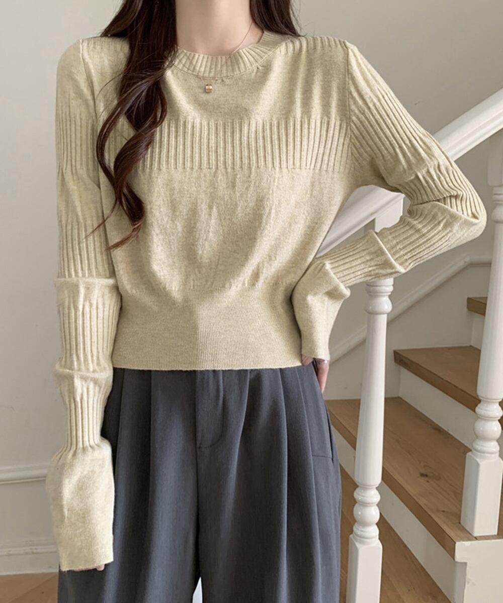 カジュアル ニット 長袖 無地トップス 着やせ リブニット