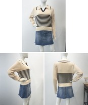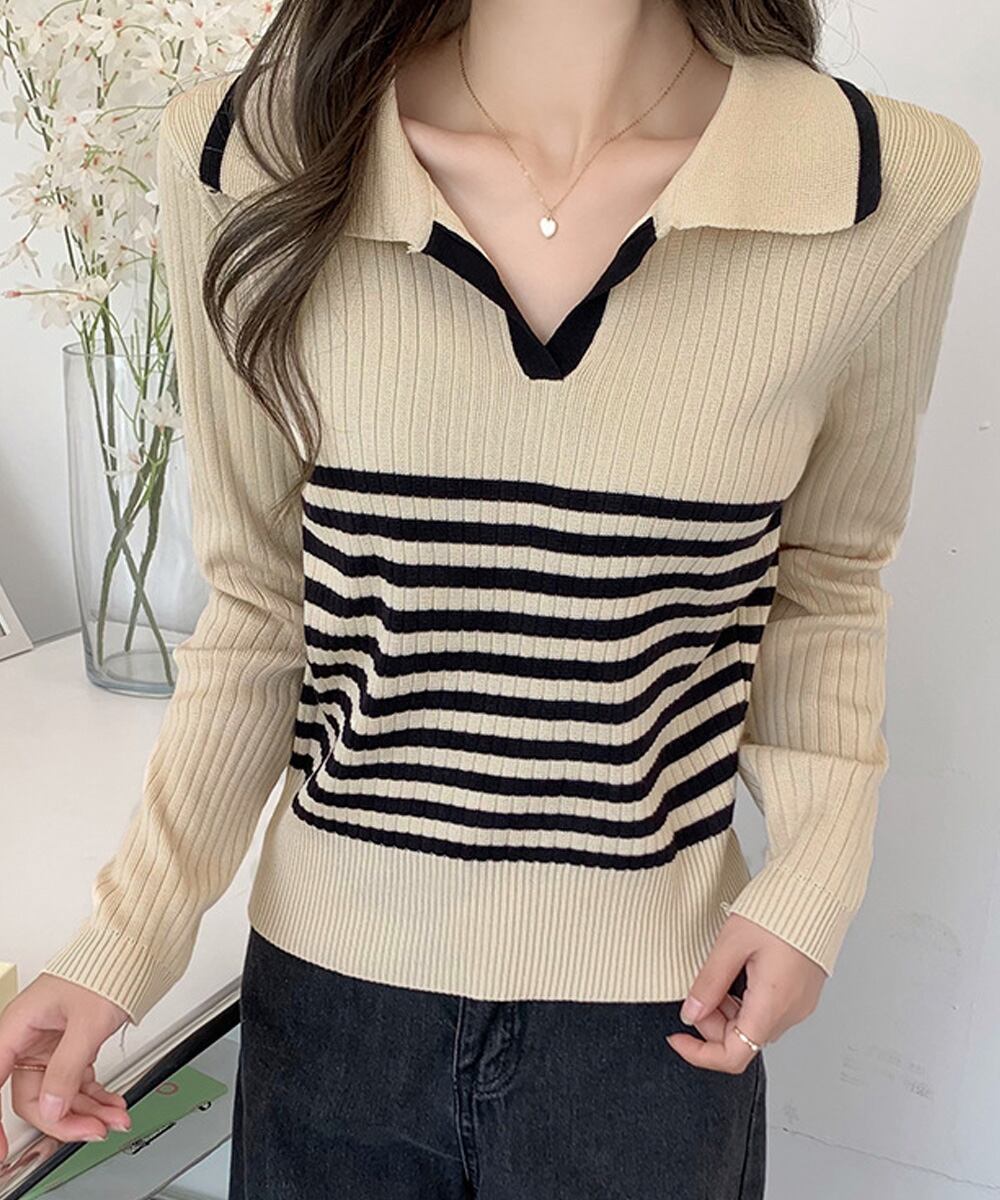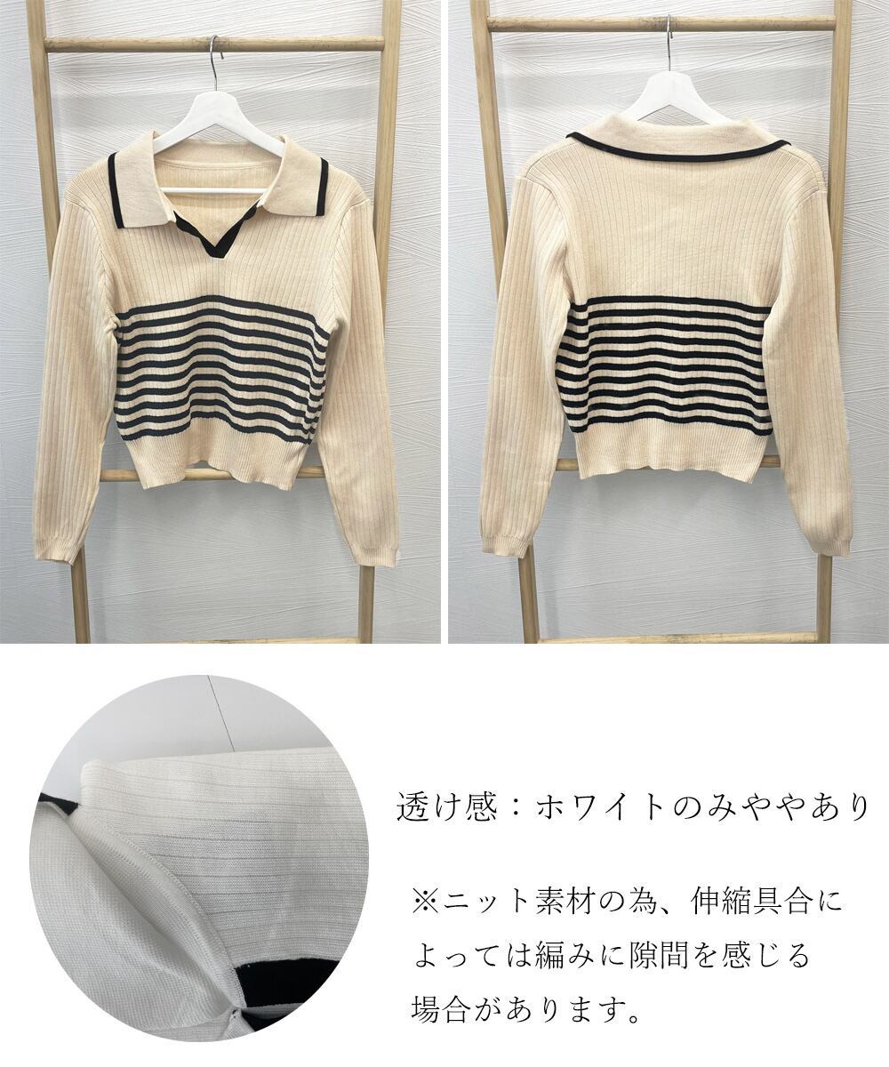 大人シックなモノトーンボーダーの色合い、デリケートな女性の肌を優しく包み込むしなやかなニット生地ポロシャツ