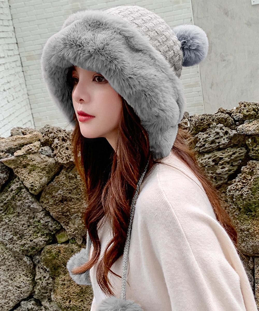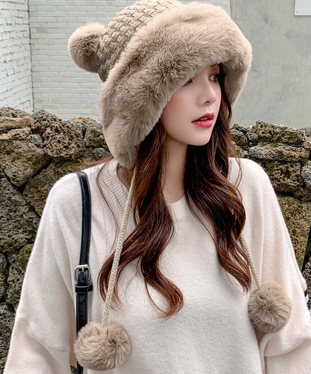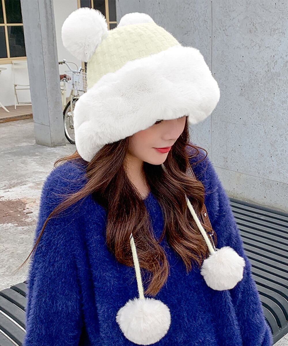 ニット生地にふわふわエコファー、可愛いポンポンが付いたレディース帽子
