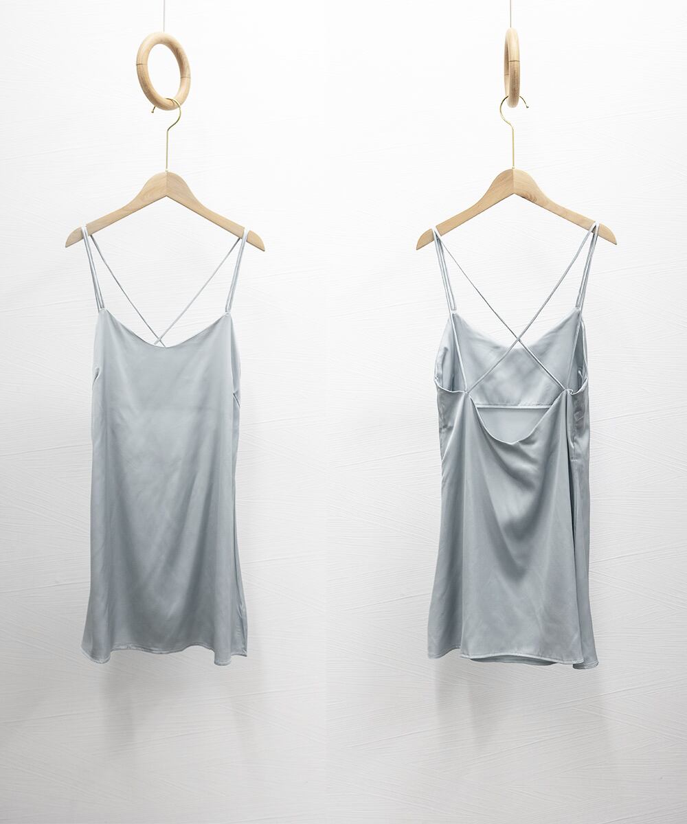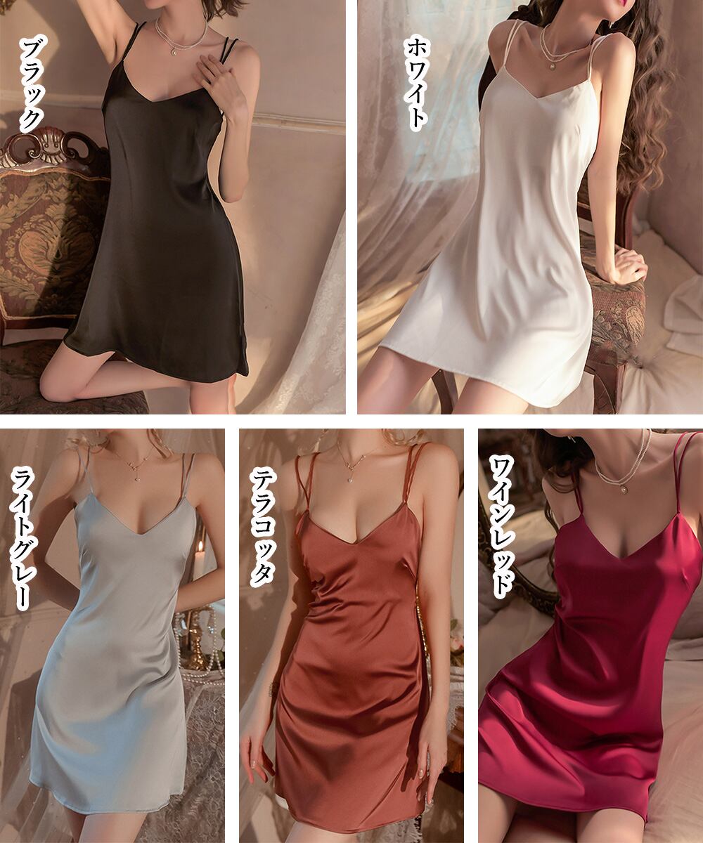 光沢感のある生地で仕上げたキャミワンピースとTバックの2点セット