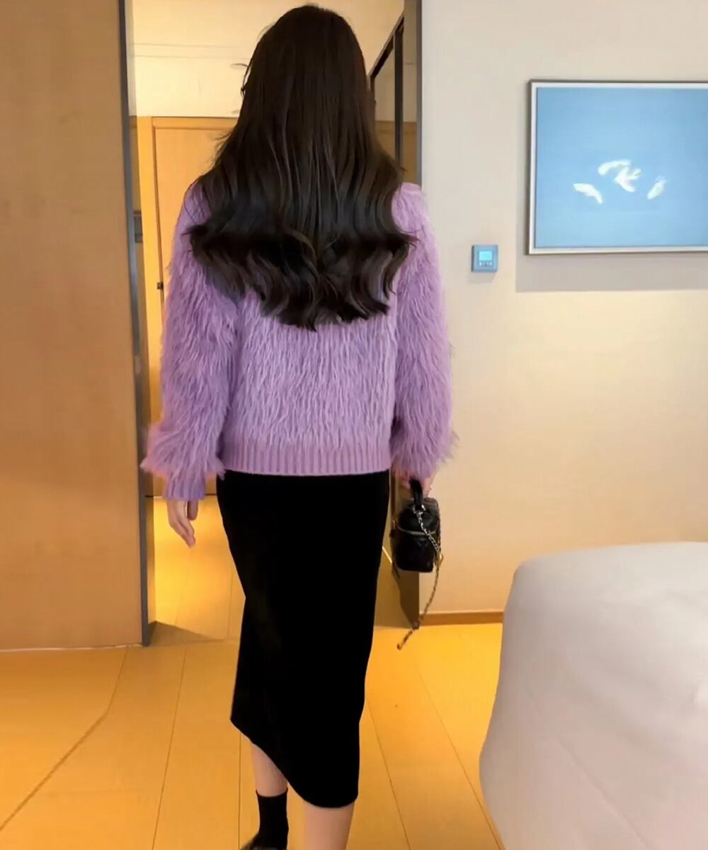 フワフワの肌触りの良いシャギーニット素材を使用し、暖かく柔らかい着心地のカーディガン