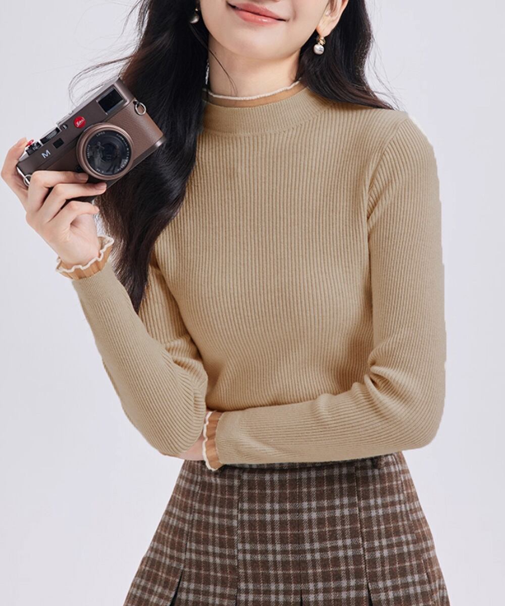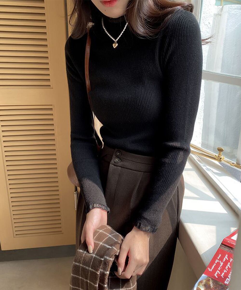 コンパクトな着心地が女っぷりを高めてくれる長袖リブニットトップス