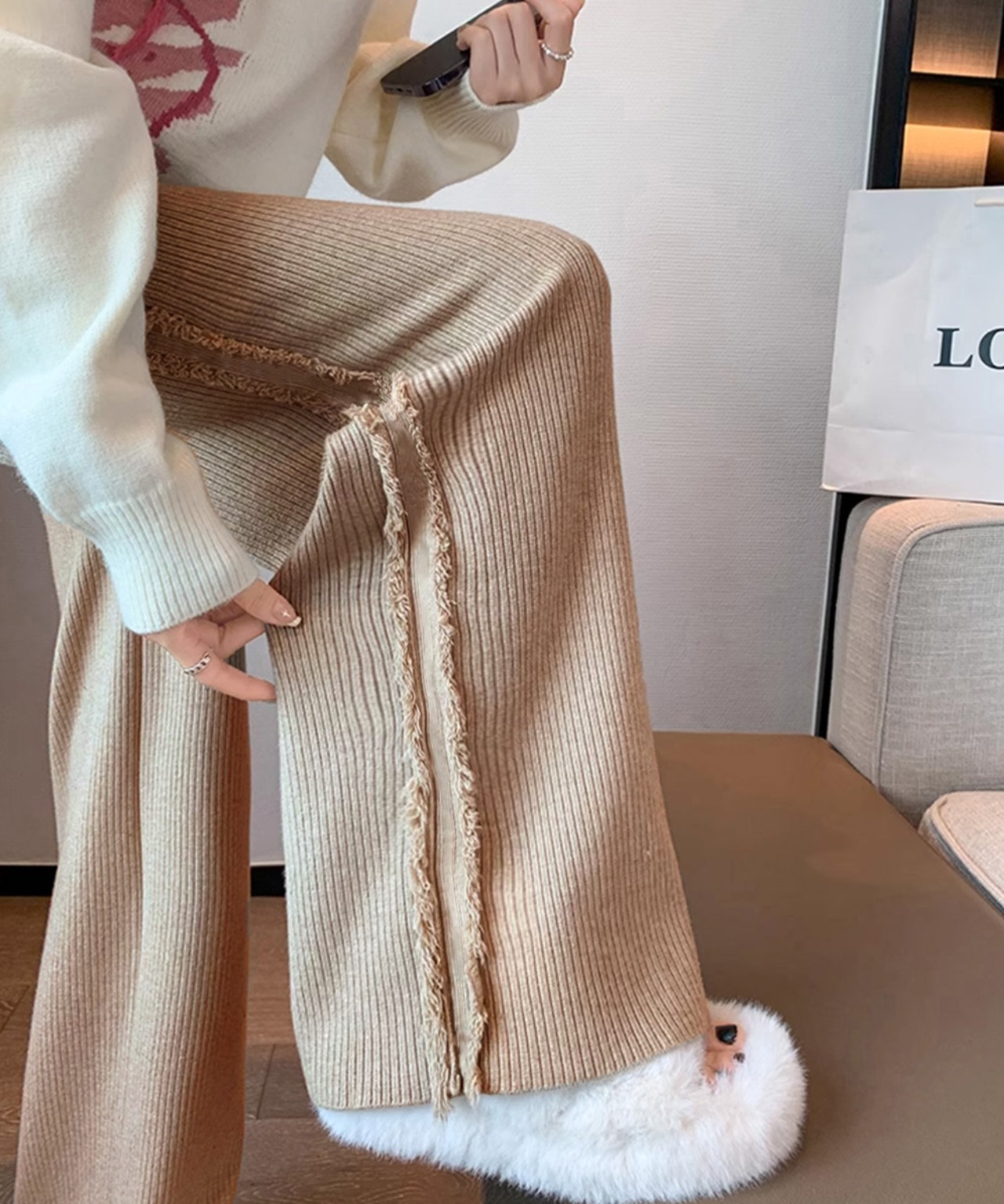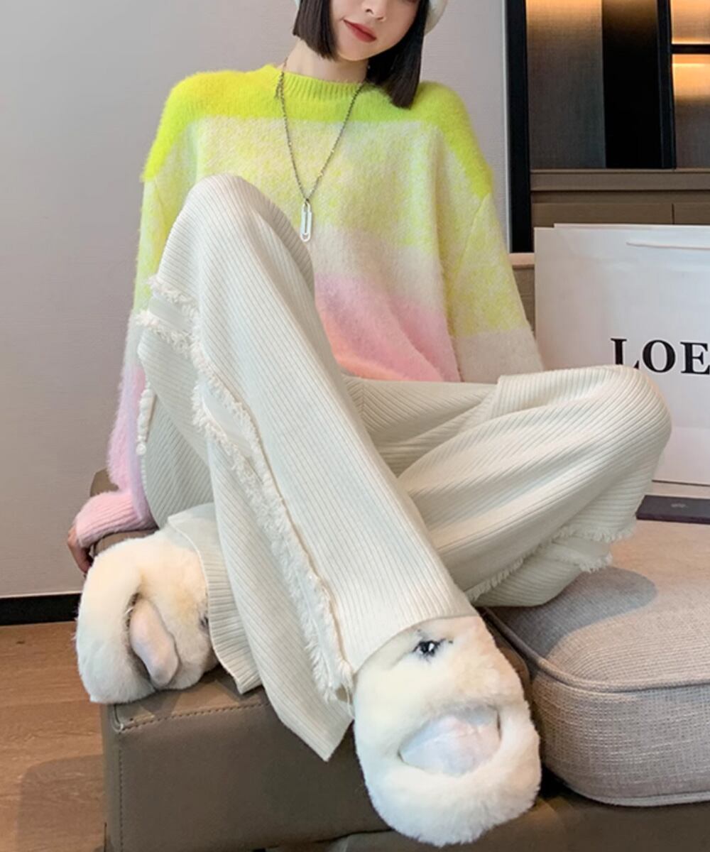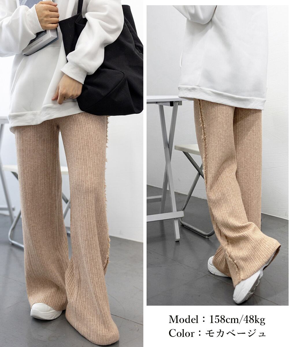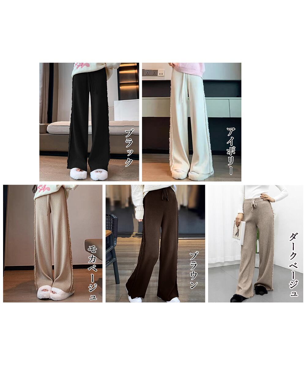 サイドフリンジ リブニットパンツ 暖かい