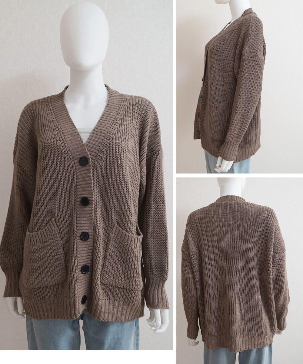 秋冬 ニットトップス ミドル丈 あぜ編み ポケット付き ニットセーター ドロップショルダー ルーズニット Vネック 長袖