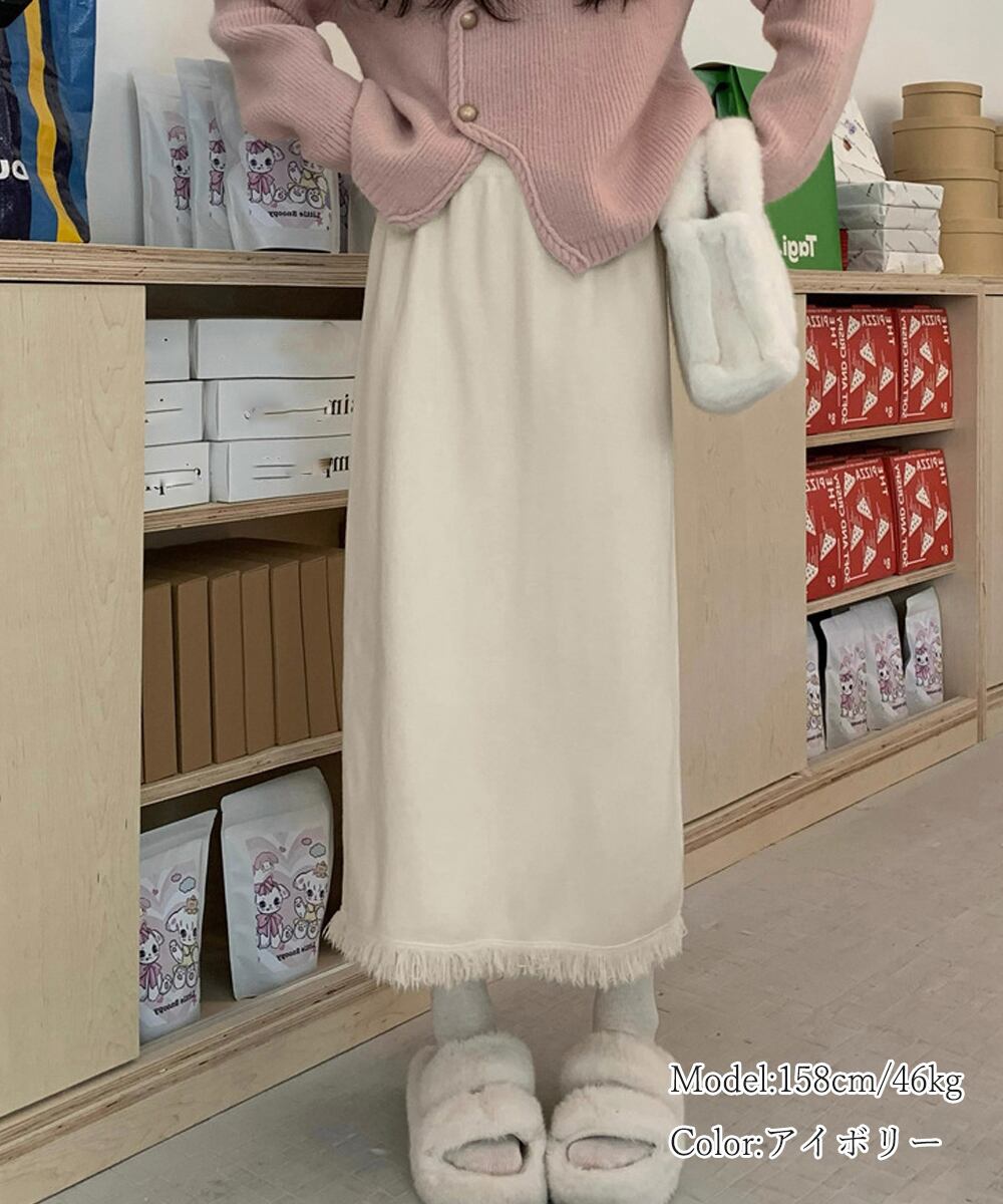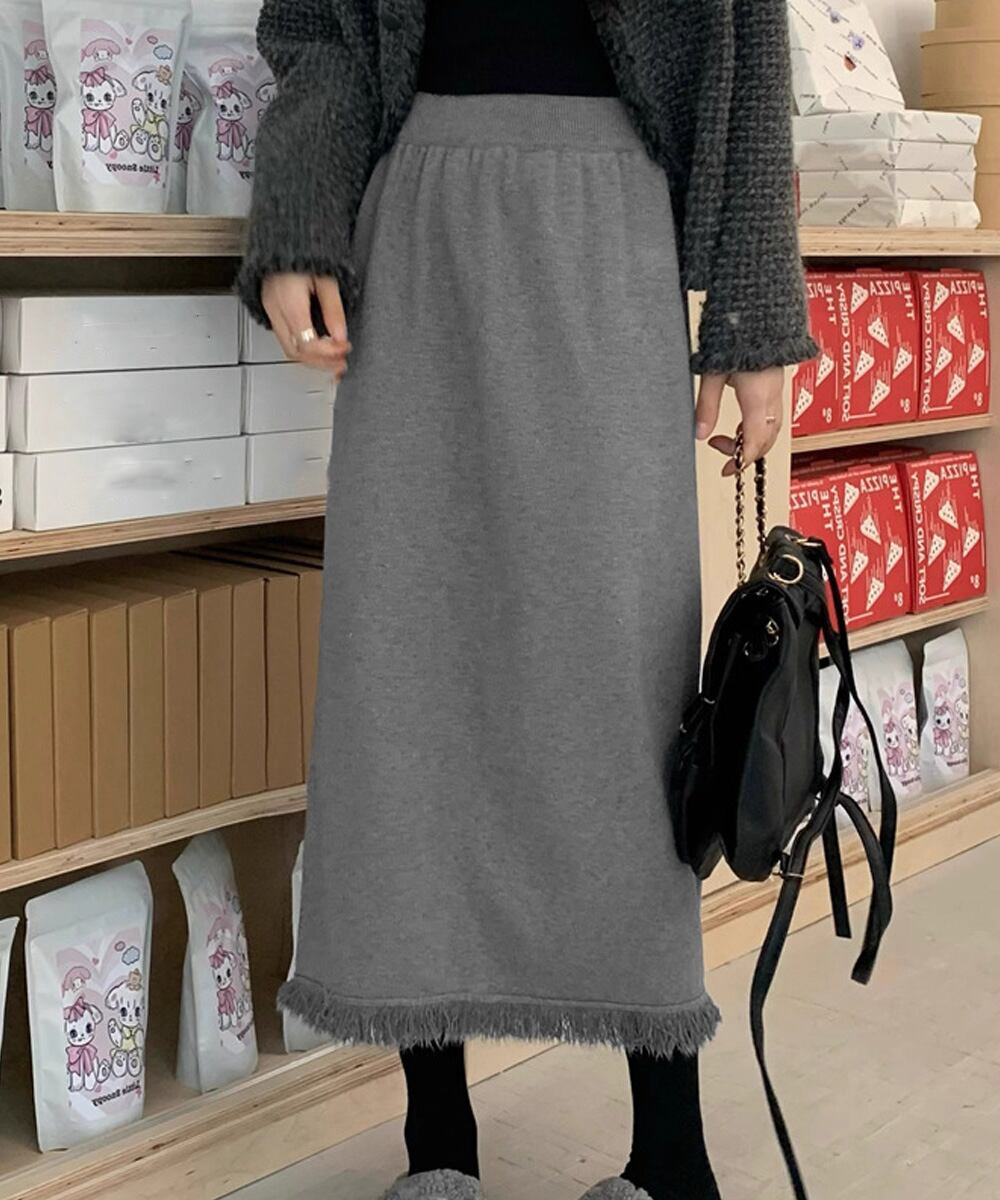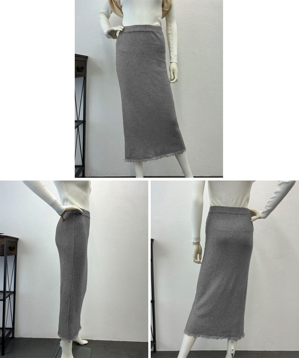 体のラインを拾いすぎないセミタイトが女性らしい着こなしを演出する裾フリンジニットスカート