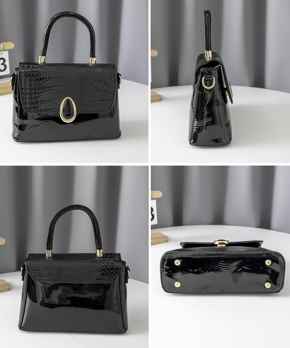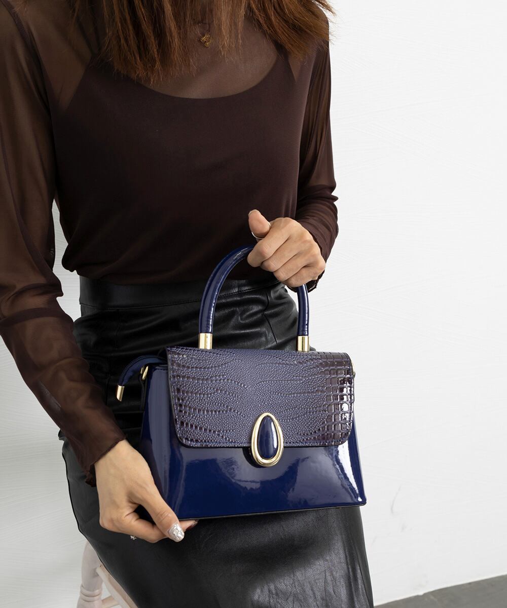 クロコ型押しフラップとエナメルの合皮を組み合わせたフォーマルハンドバッグ