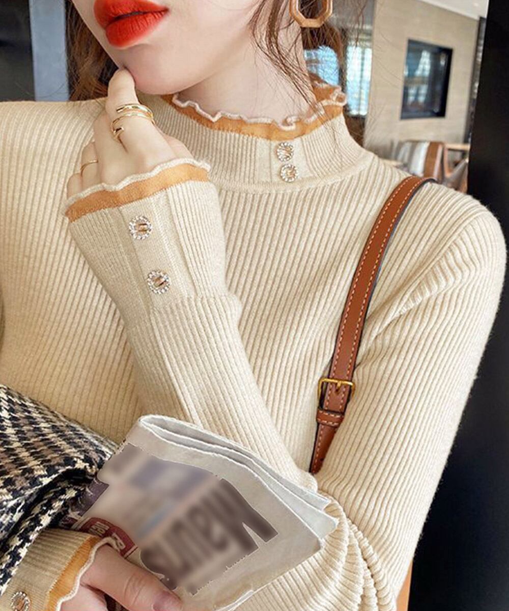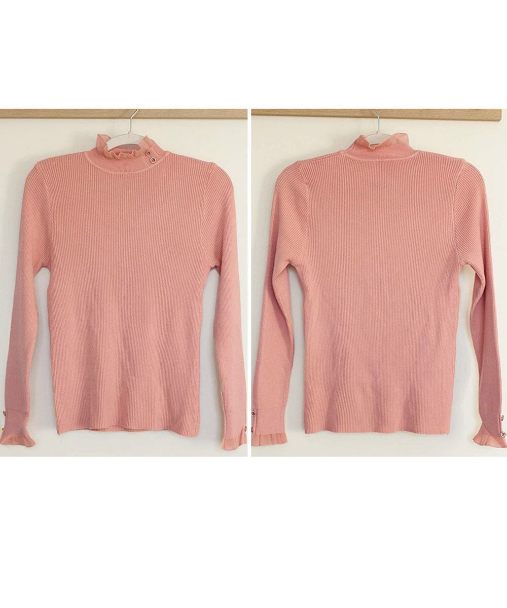 襟元と袖口にキラッと輝くボタンとフリルが可愛いプチハイネックリブニット