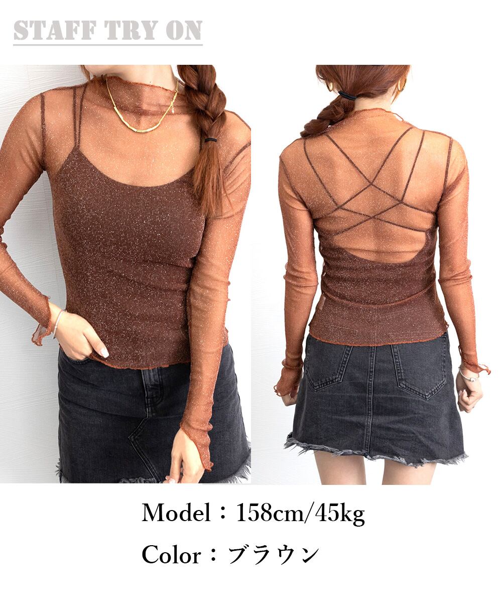 ラメ感のあるデザインでコーディネートを華やかに仕上げるシースルートップス