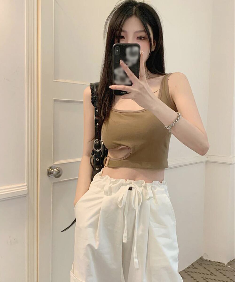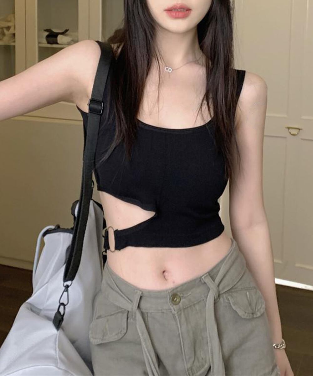 サイドカットアウト タンクトップ ショート丈 インナートップス 韓国 見せインナー カジュアル重ね着 へそ出し セクシー