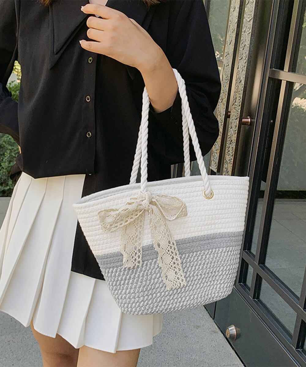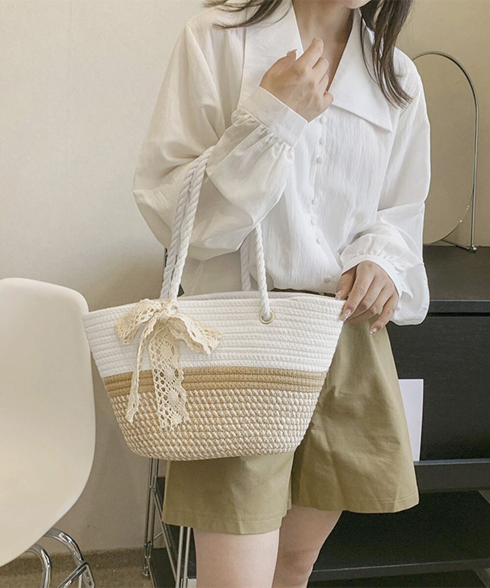手提げにレースリボンを巻きつけ、レトロでエレガントなアクセントを添えた