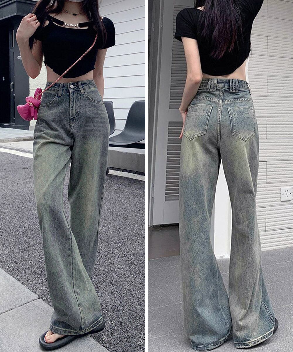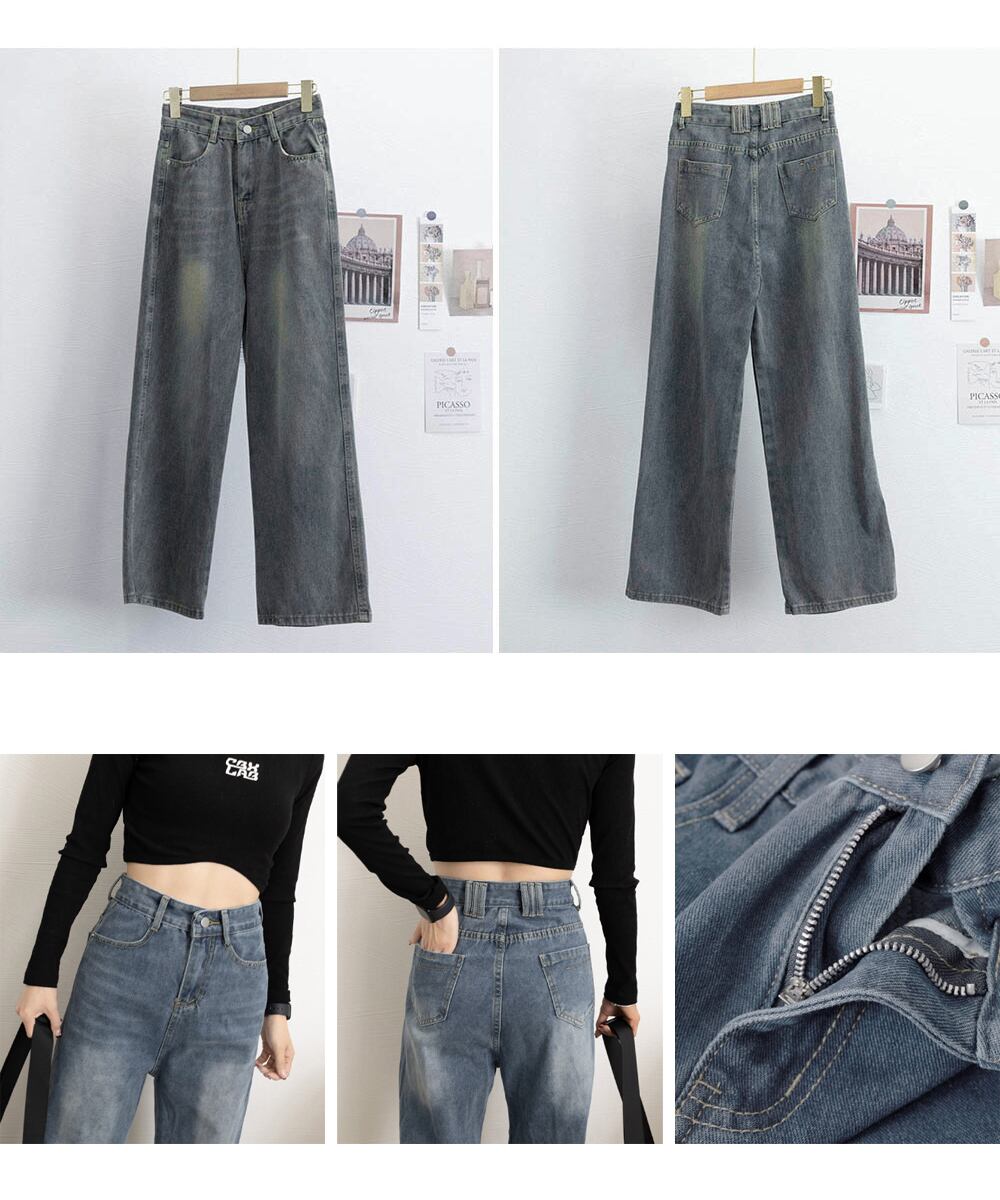 レトロ風ジーンズ ハイウエスト ウォッシュデニム 美脚脚長 セミワイドパンツ フルレングス 着やせジーパン 体型カバー