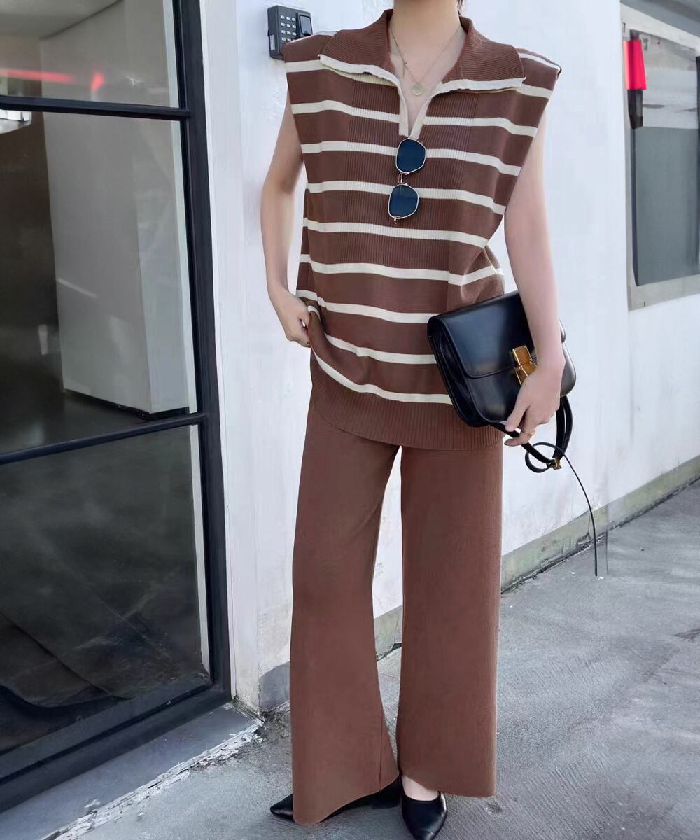 ボーダ柄ポロカラーサマーニットxハイウエストワイドレッグパンツのセットアップ