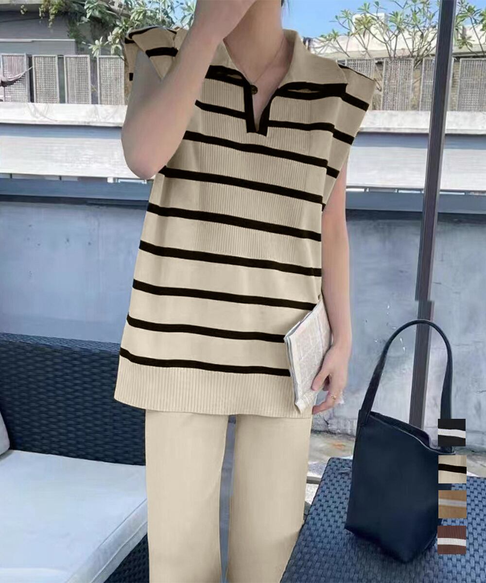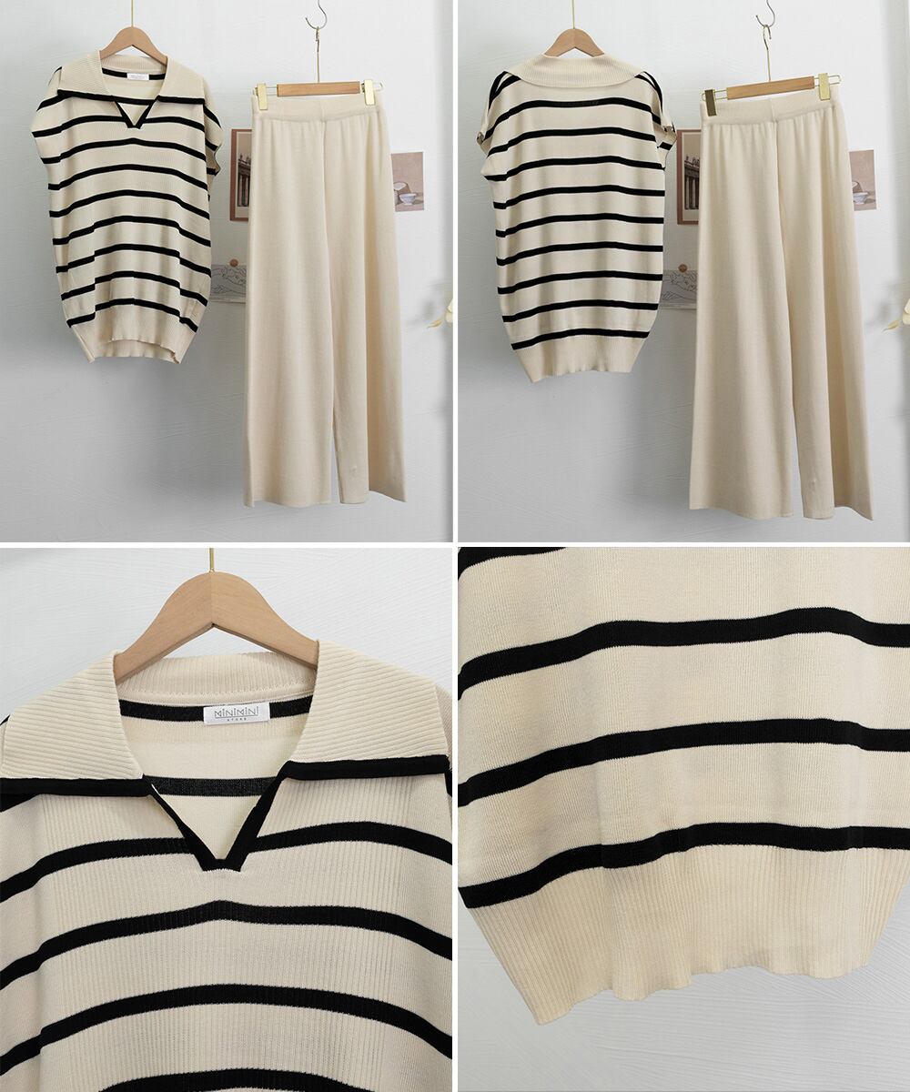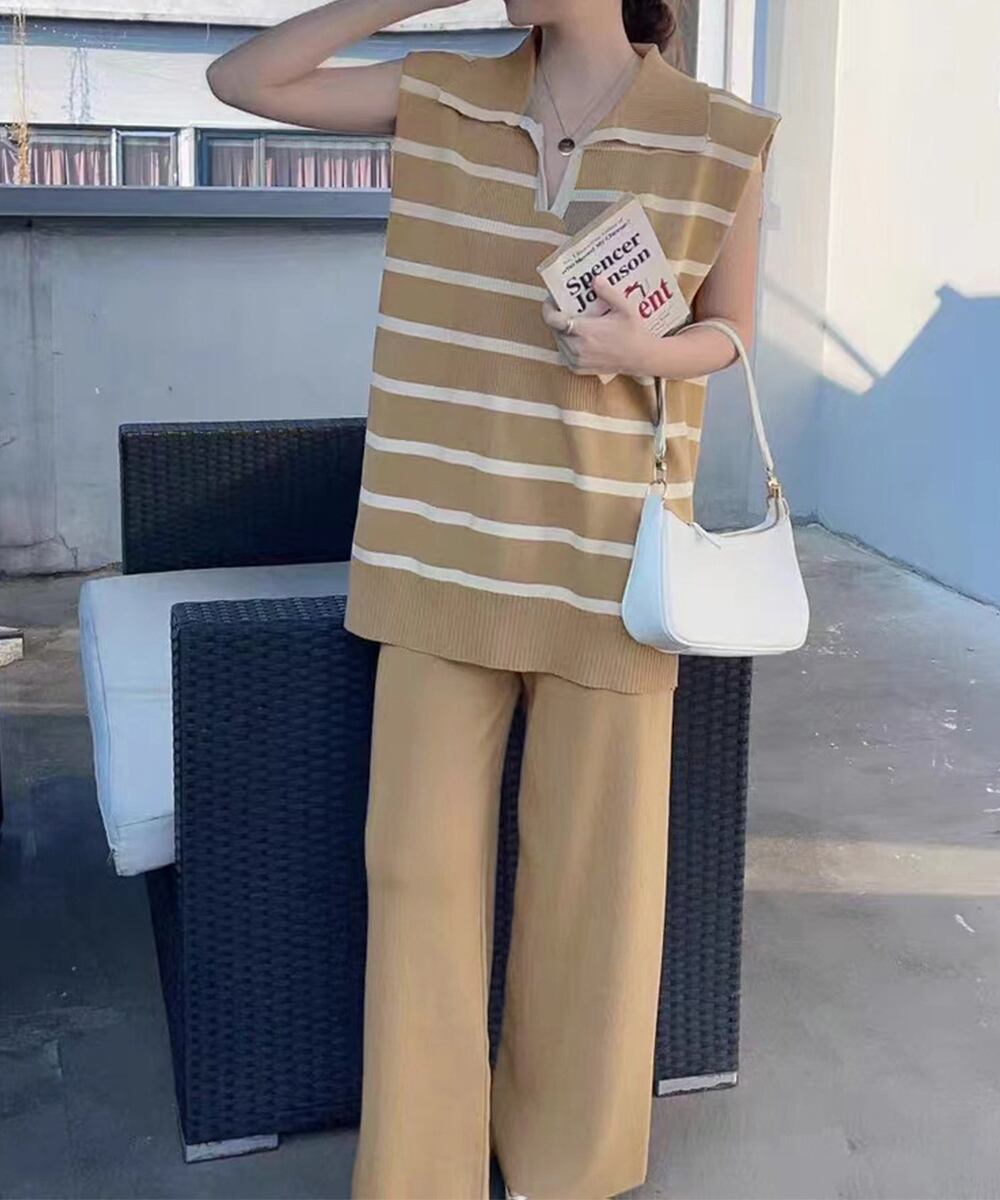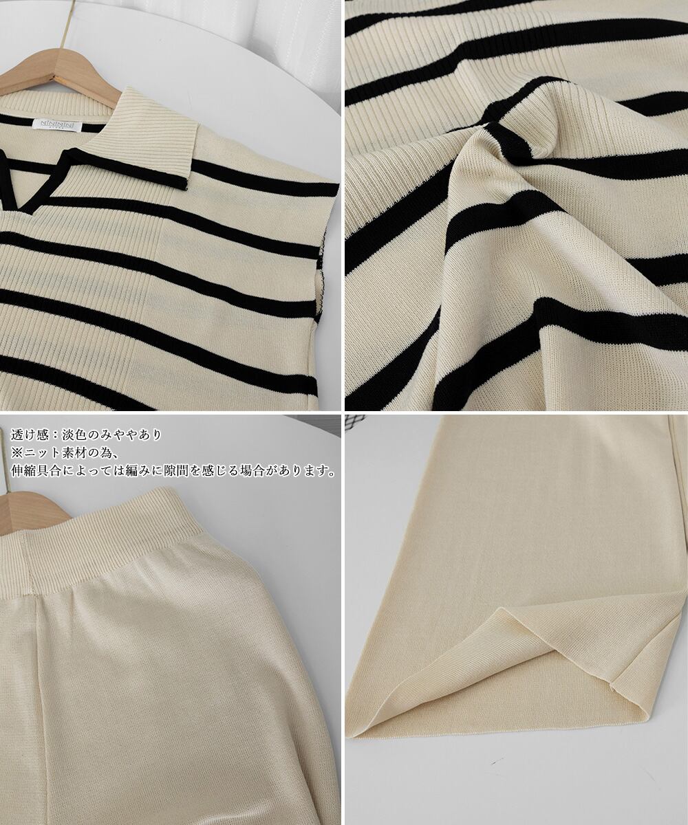 ツーピースセット ボーダ柄 ポロサマーニット ワイドパンツ 2点セット ゆったり オフィスカジュアル ニットアンサンブル