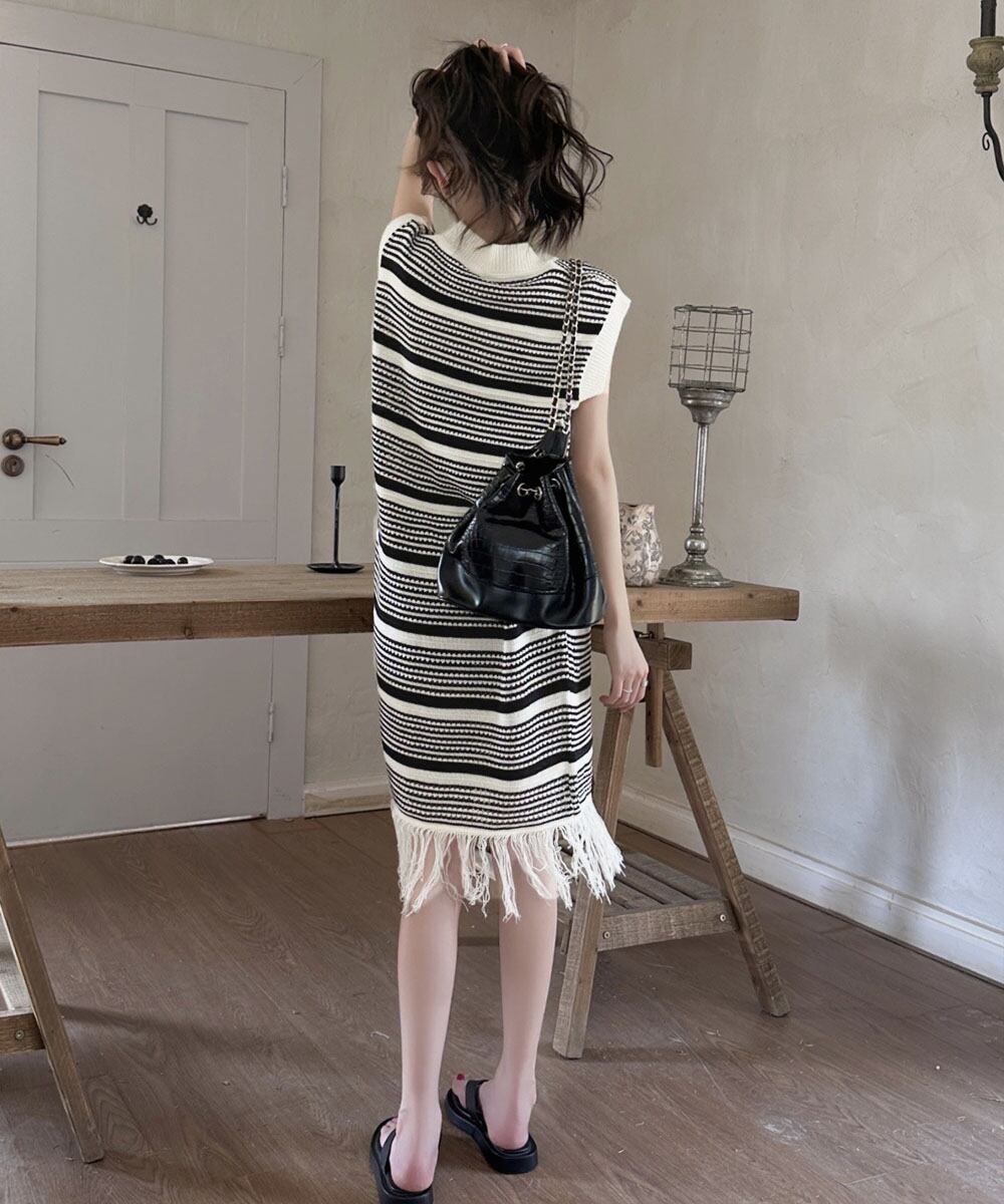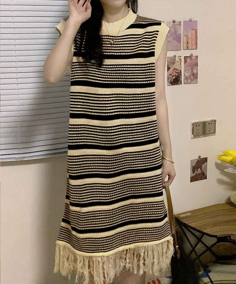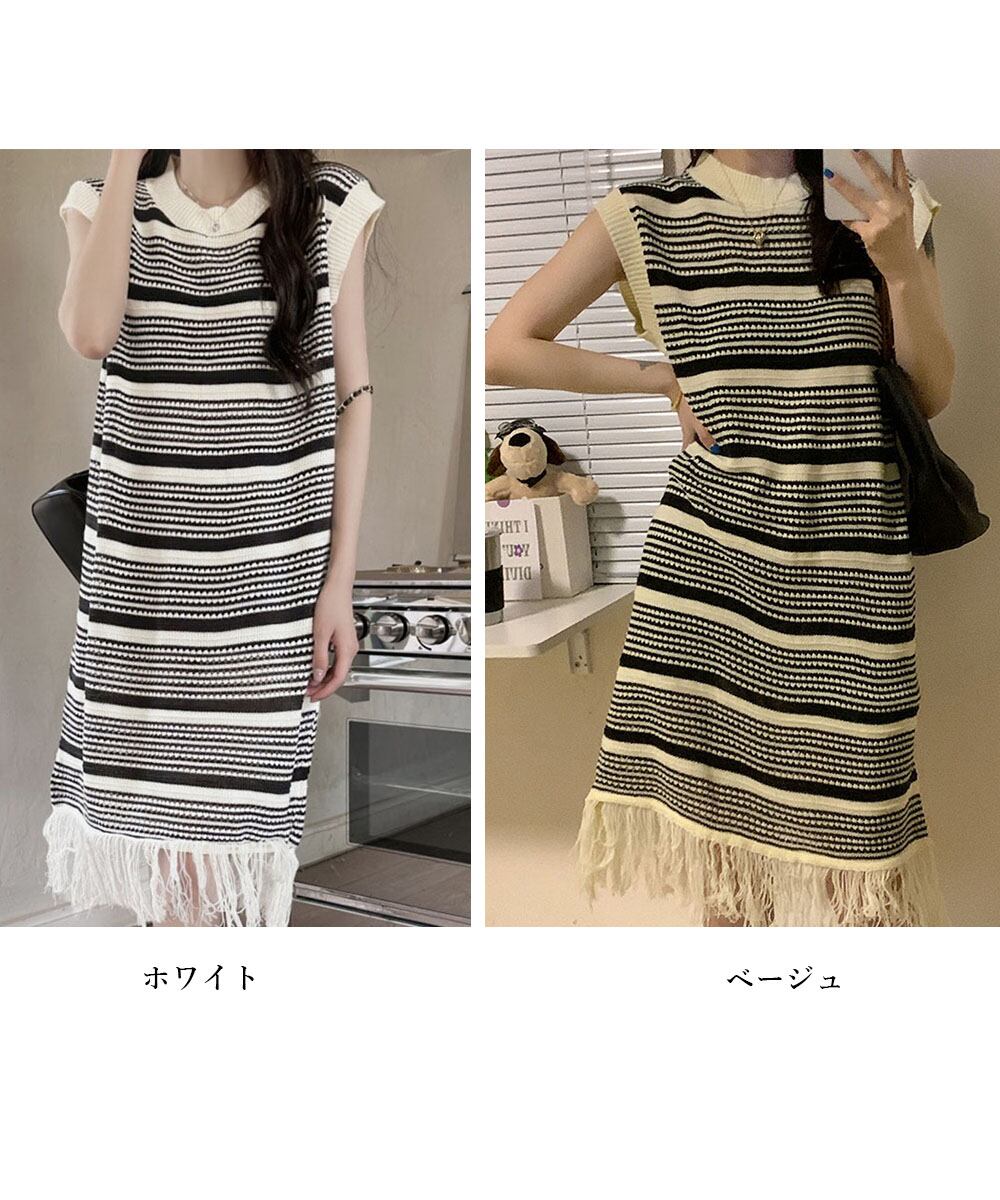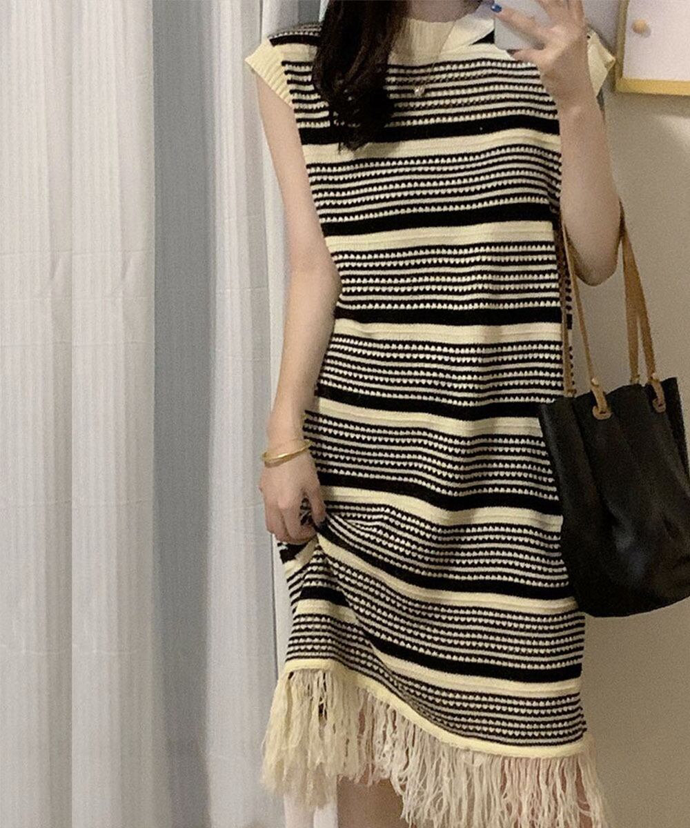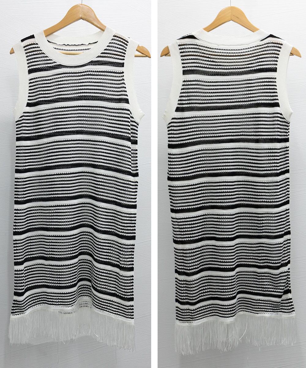 ノースリーブワンピース フリンジ バイカラー 着やせ ひざ丈 セクシー 丸首 カジュアル 普段使い チュニックワンピ