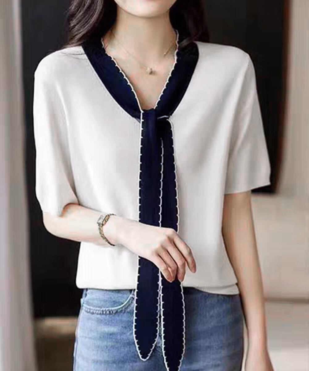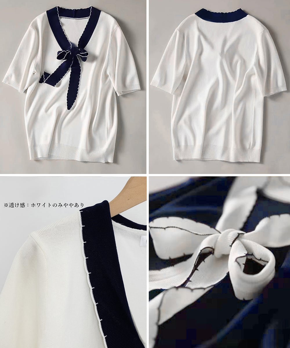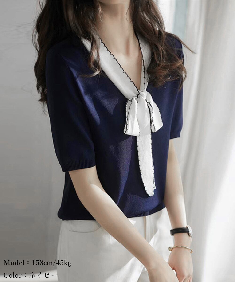 衿元が華やかな配色デザインのボウタイ付きニットプルオーバー