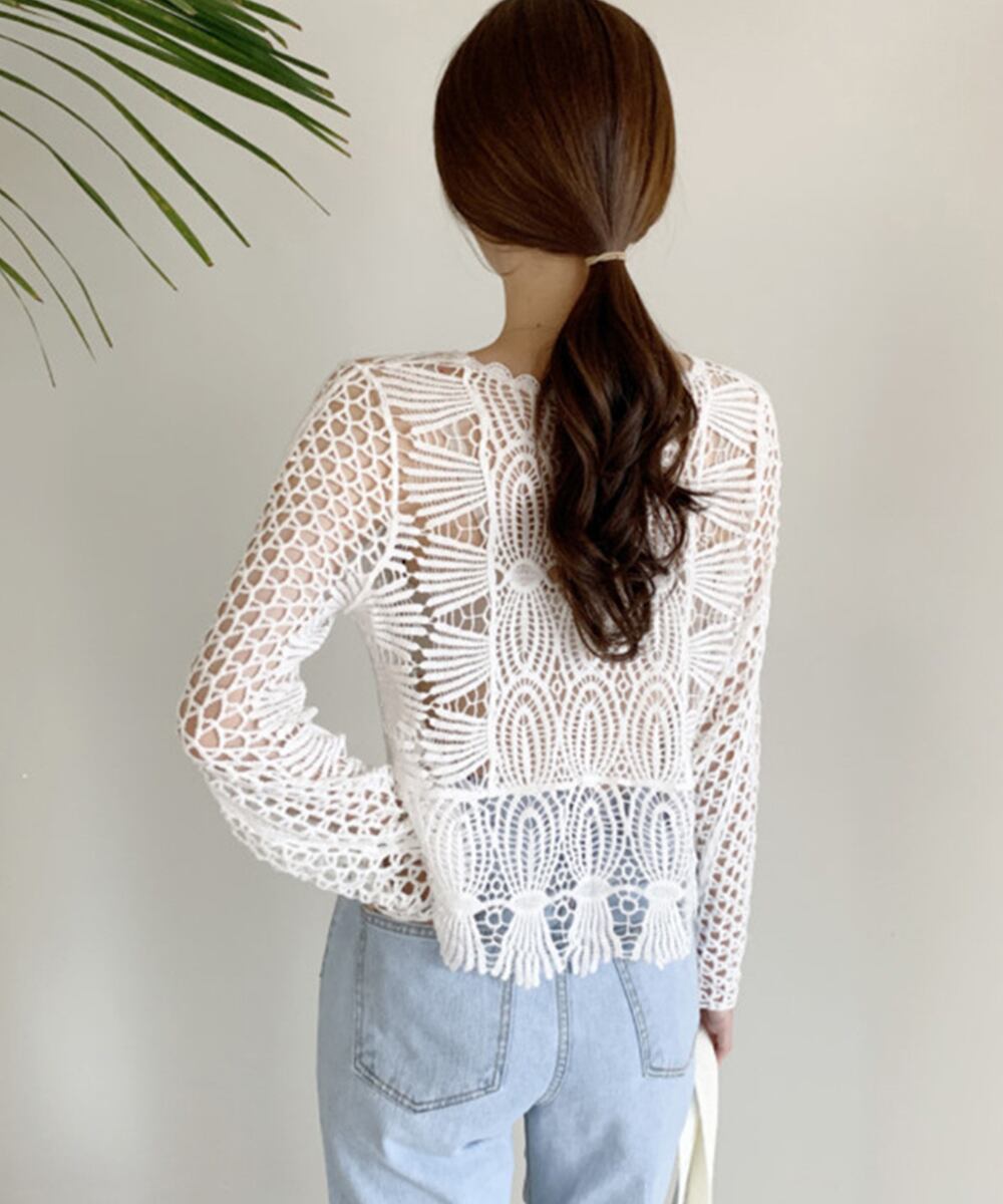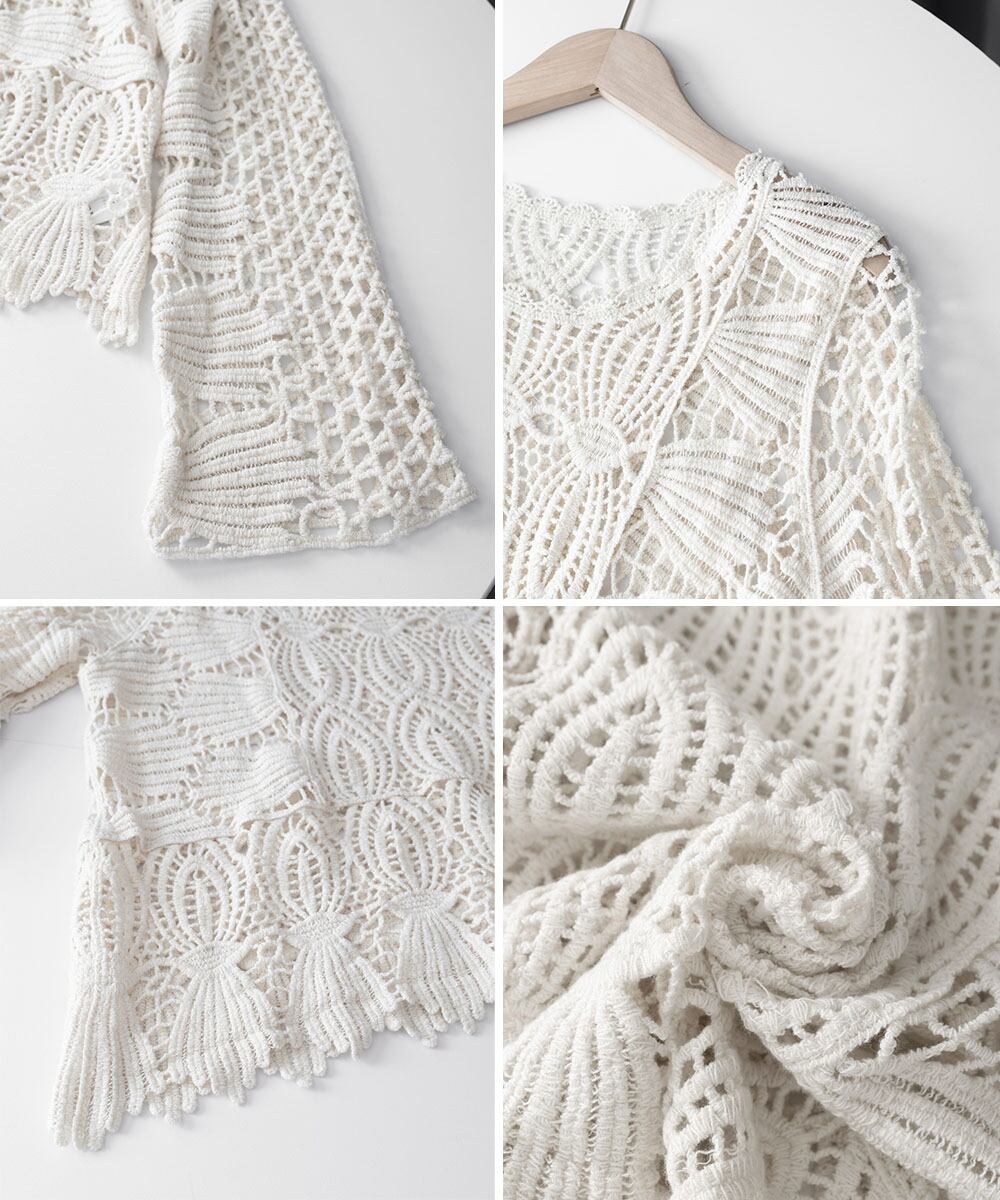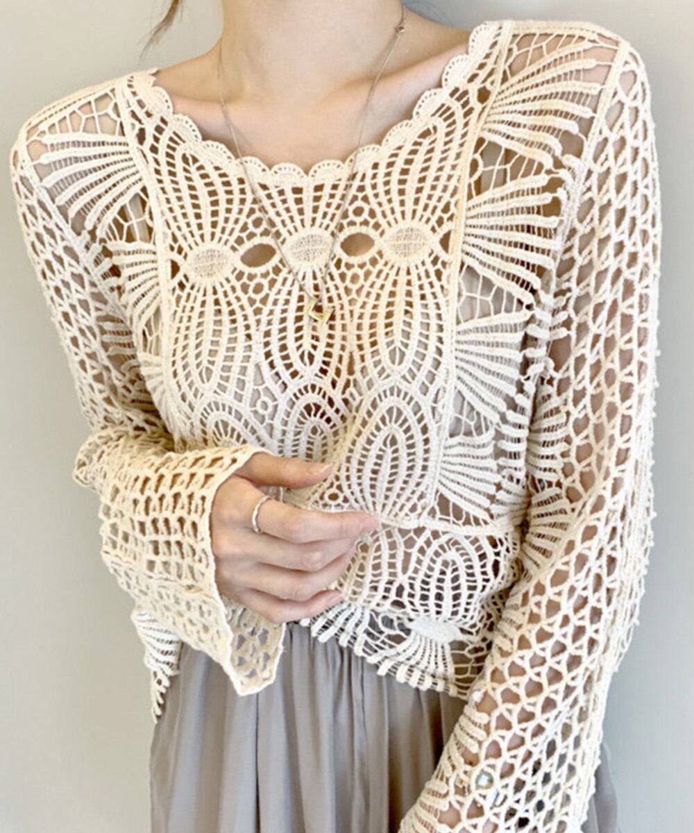 トレンドの透かしクロシェ編みデザインが目を引くサマーニット