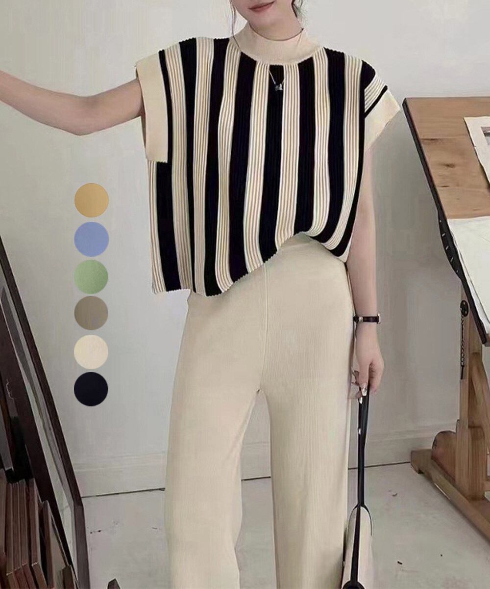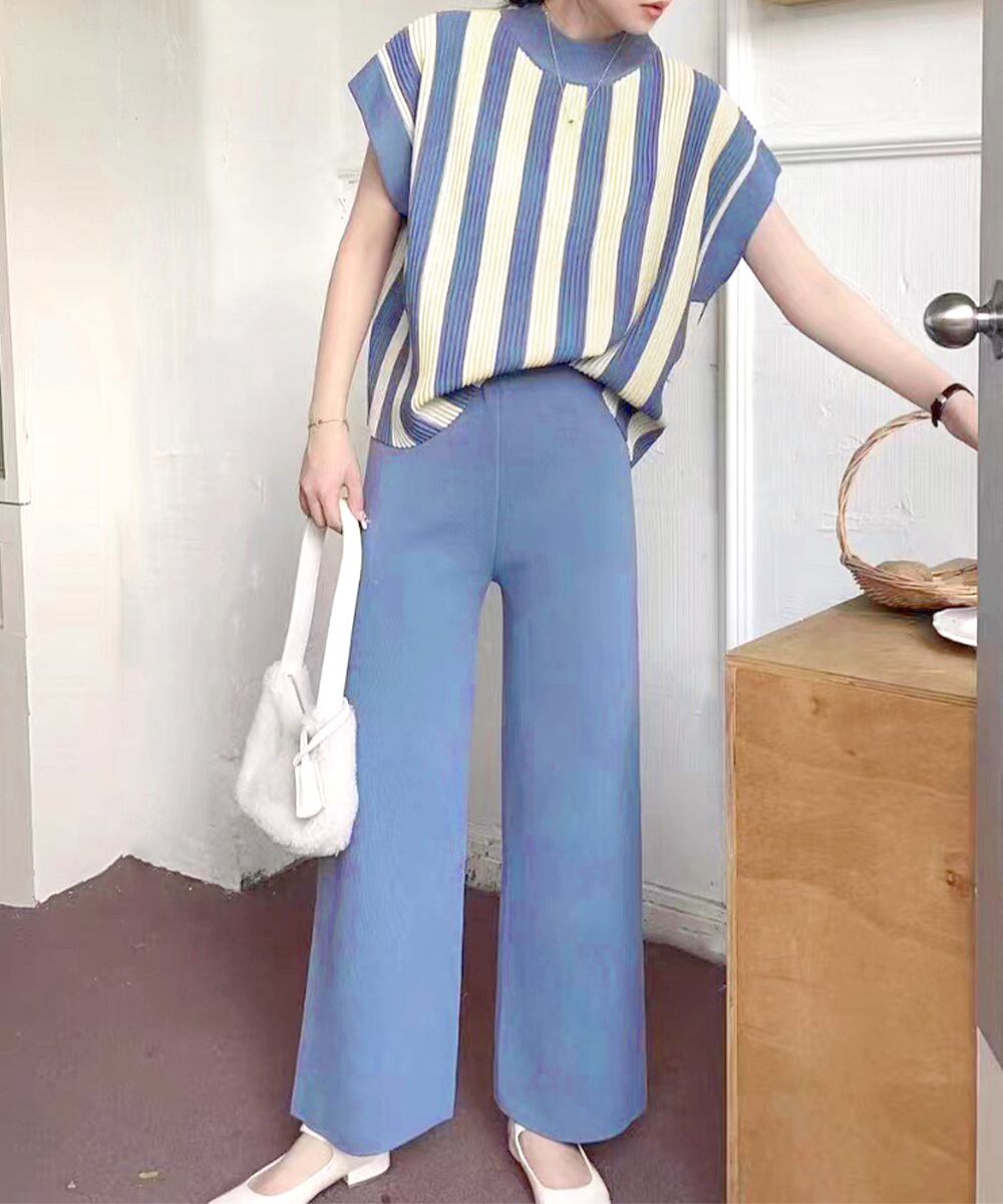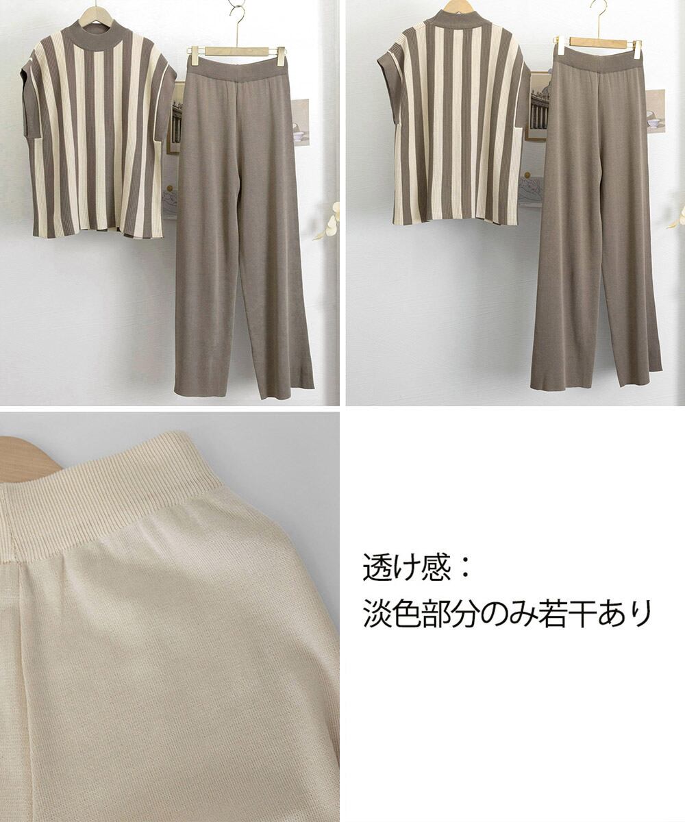 半袖ストライプニット フレンチスリーブトップス ニットワイドパンツ 上下2点セットオフィスカジュアル 20代30代40代