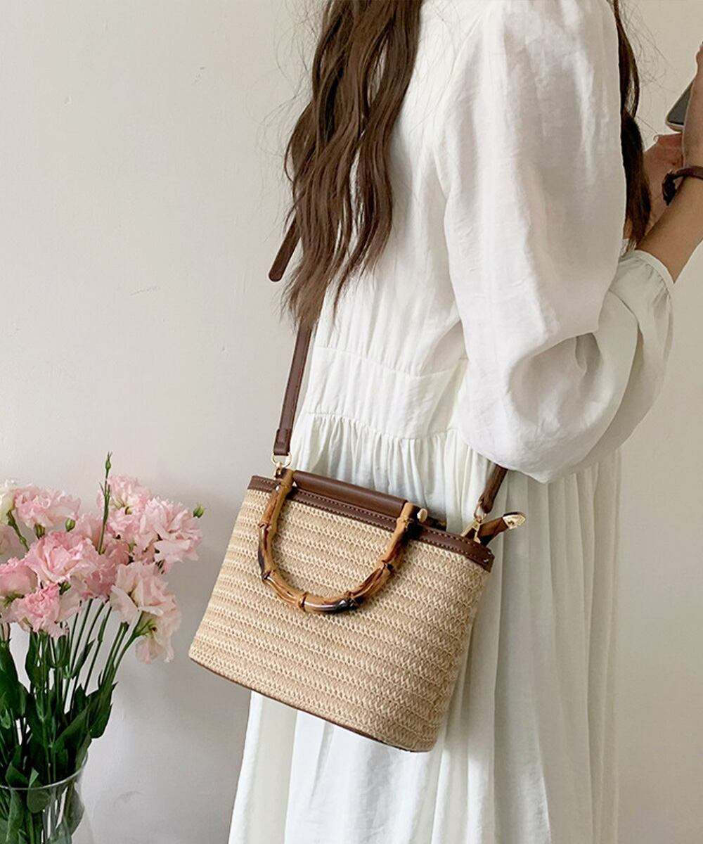 夏っぽい麦わら素材とフェイクレザーがカジュアルになり過ぎず、小さめで持ち運びも楽々
