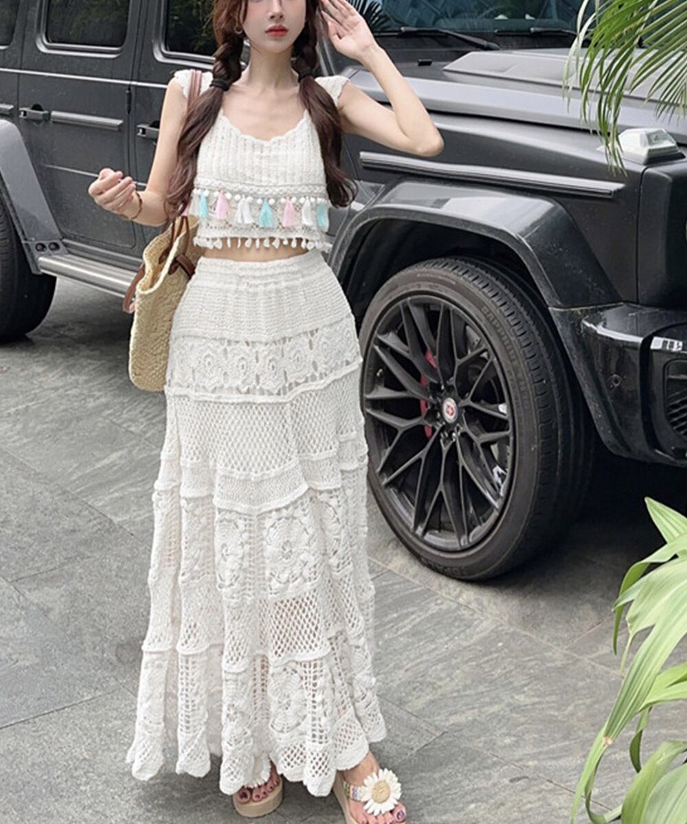 透かし編みビスチェ ロングスカート レディース サマーニット2点セットフリンジタンクトップ フレアスカート ビーチウェア